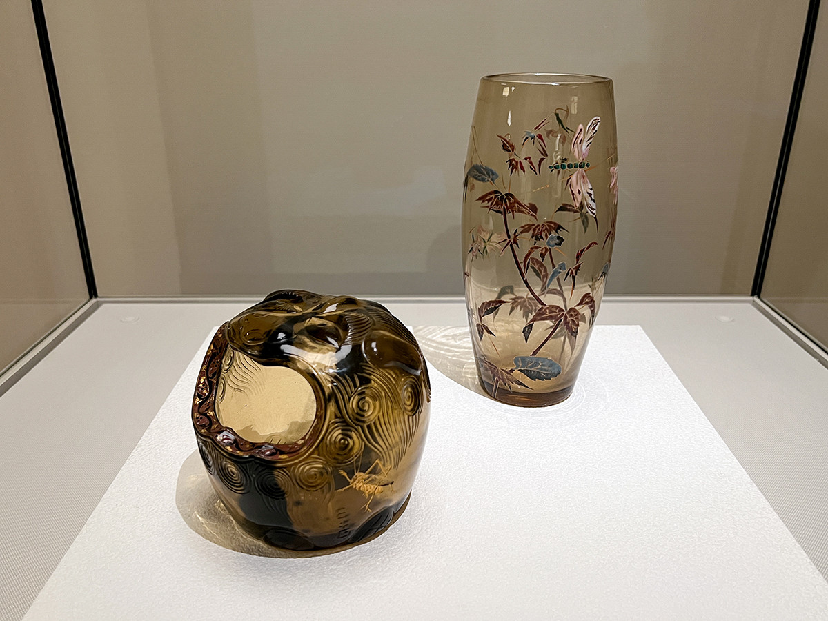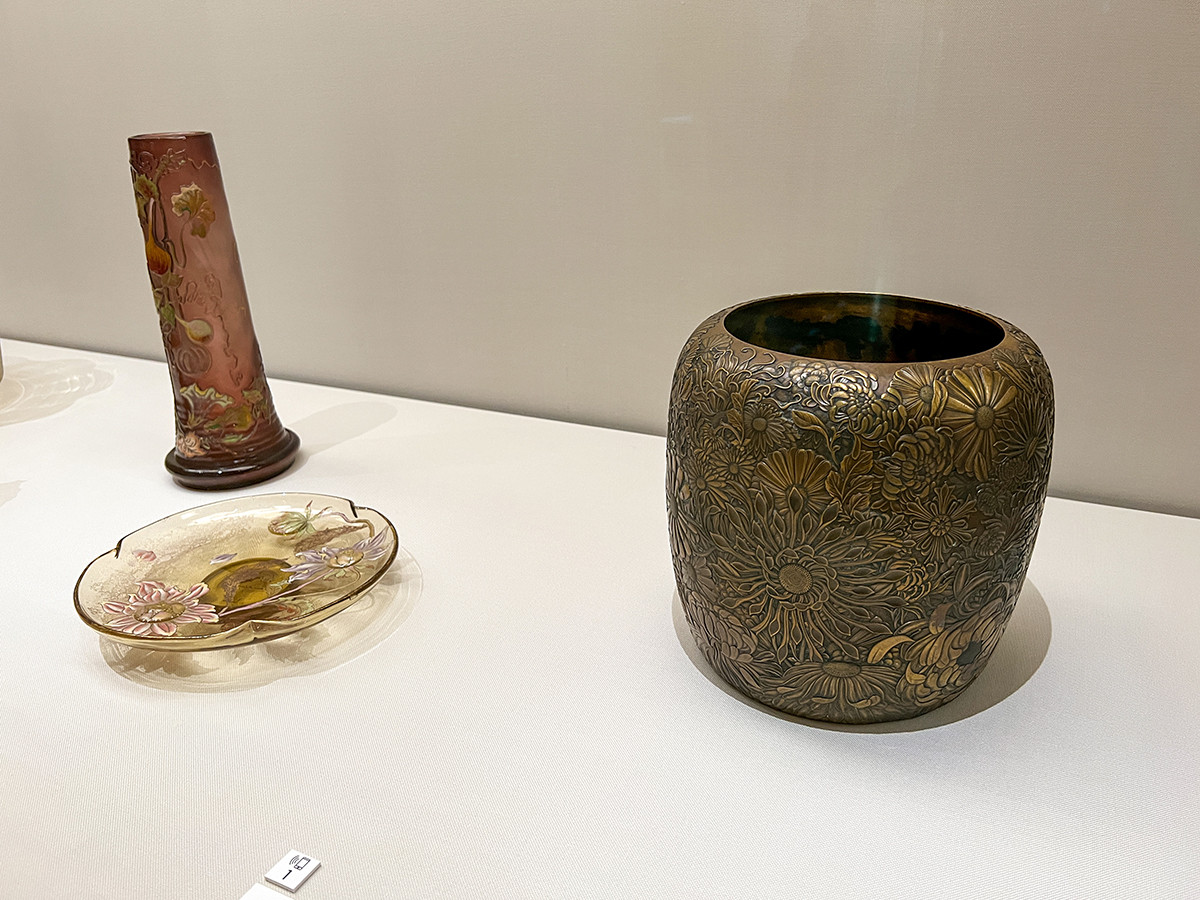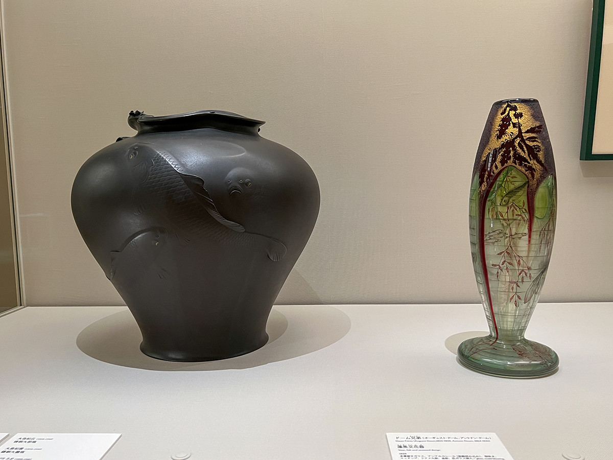 (左から)大島如雲《鋳銅大膽瓶》1907年 / ドーム兄弟(オーギュスト・ドーム、アントナン・ドーム)《藻魚文花器》1898年