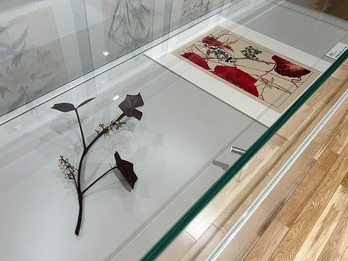 (左手前から)北原千鹿《山葡萄置物》1927年頃 / 杉浦非水《非水百花譜》第20輯-5やまぶだう(山葡萄)1920-22年(春陽堂・発行)