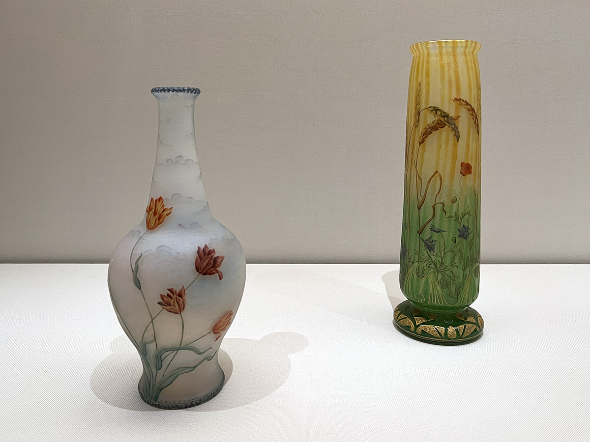 (左から)ドーム兄弟(オーギュスト・ドーム、アントナン・ドーム)《チューリップ文花瓶》1898年 / ドーム兄弟(オーギュスト・ドーム、アントナン・ドーム)《麦文花器》1905年