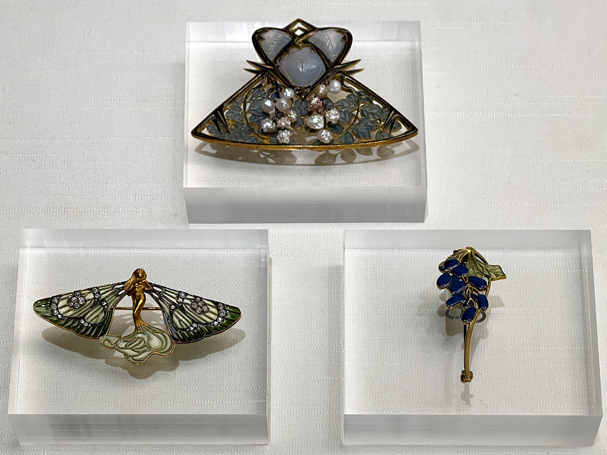(左から)ルネ・ラリック《ブローチ 翼のある風の精》1898年頃 / ルネ・ラリック《ブローチ 桑の木と甲虫》1900年頃 / ルネ・ラリック《ブローチ》1900年頃