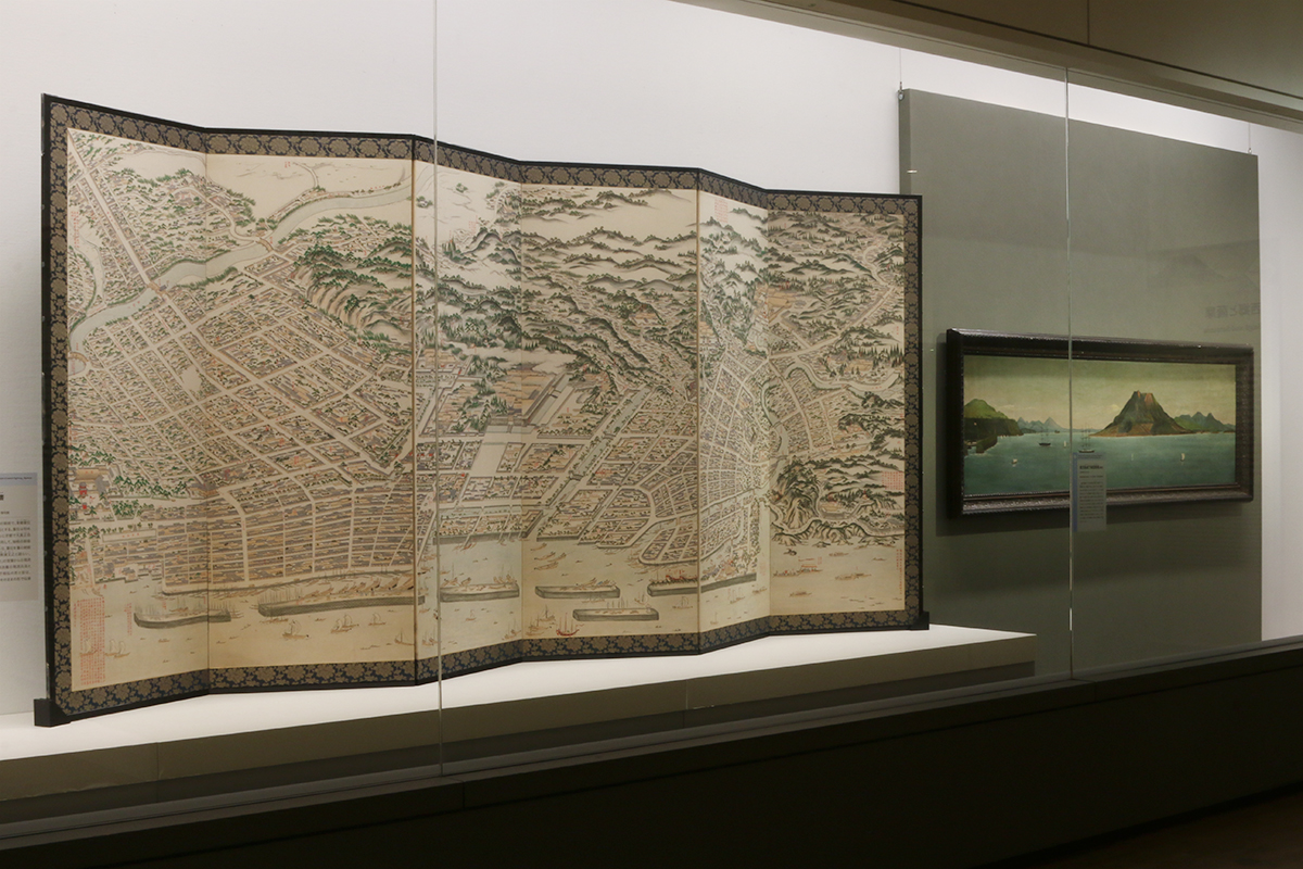 (左から)《鹿児島城下絵図屏風》(模本)鹿児島県歴史資料センター黎明館 玉里島津家資料(展示は6/17まで) / 《薩摩潟》床次正精画 鹿児島県歴史資料センター黎明館