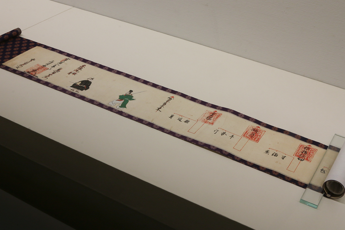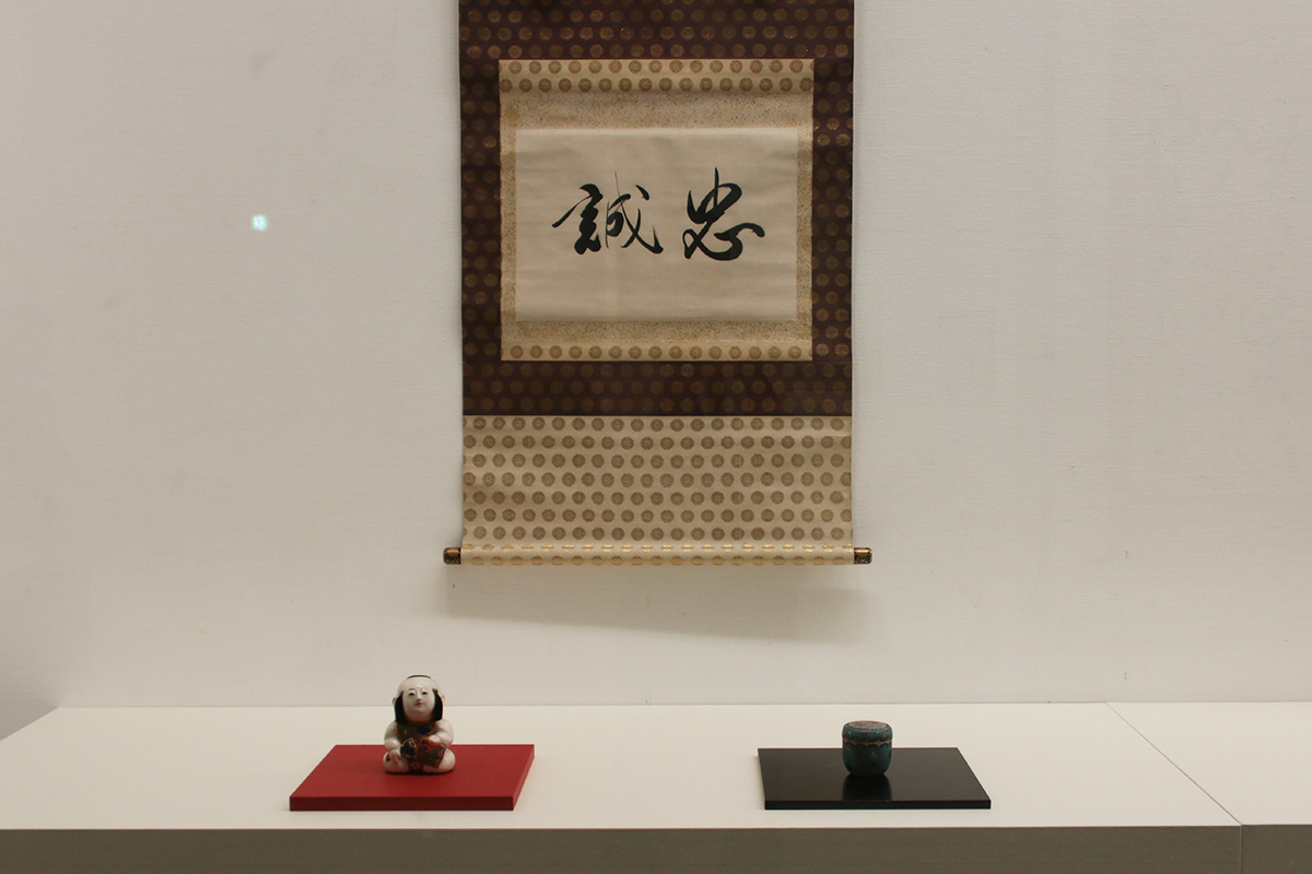 (上)《御宸筆 忠誠》孝明天皇 京都・霊山歴史館 / (手前左から)《孝明天皇愛用 御所人形》京都・霊山歴史館 / 《孝明天皇愛用 嵌金棗》六代目錦光山作 京都・三ノ宮神社