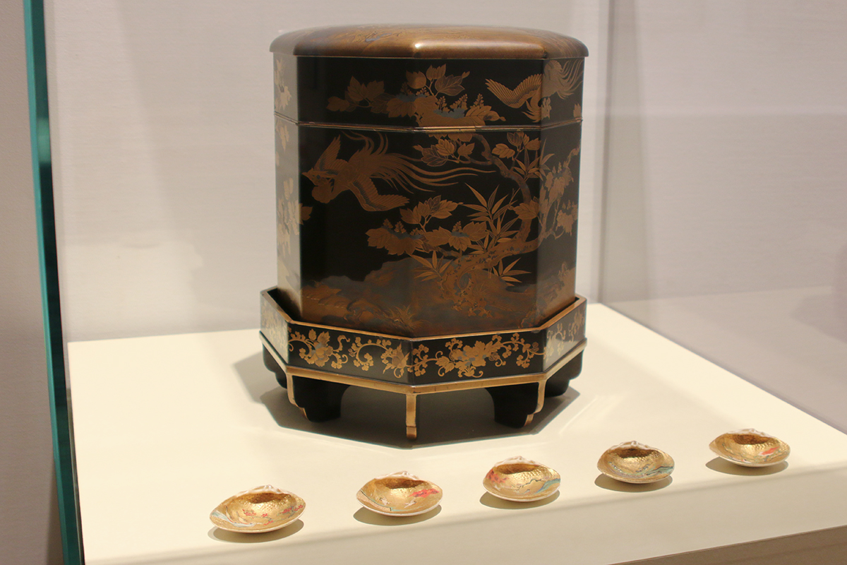 《天璋院所用 貝合道具(黒塗桐鳳凰文蒔絵貝桶・貝桶台・合貝)》東京都江戸東京博物館