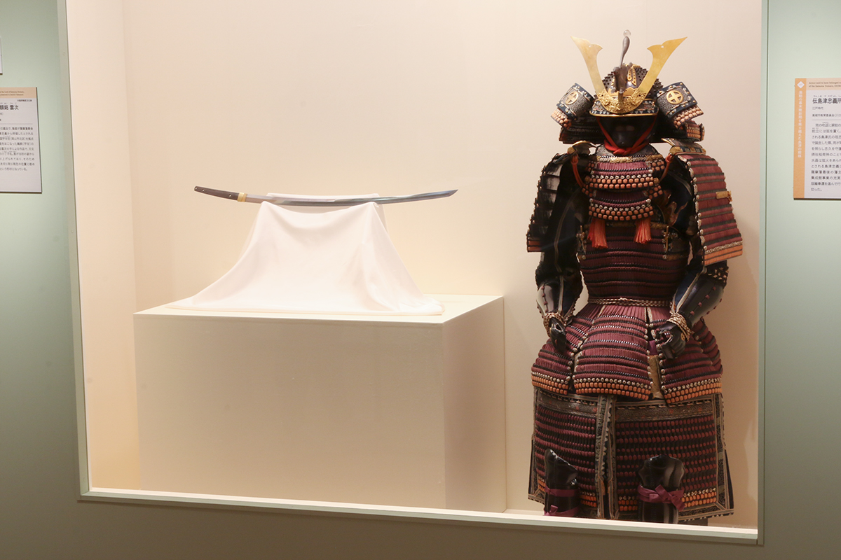 (左から)大阪府指定文化財《太刀 額銘 雲次》大阪歴史博物館 / 《伝島津忠義所用 紫糸威腹巻》高槻市教育委員会(川口コレクション)