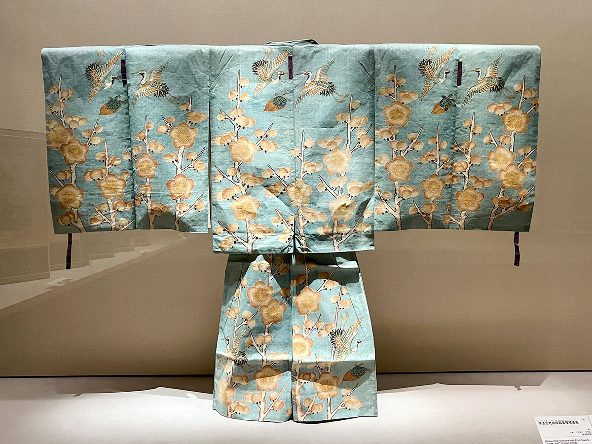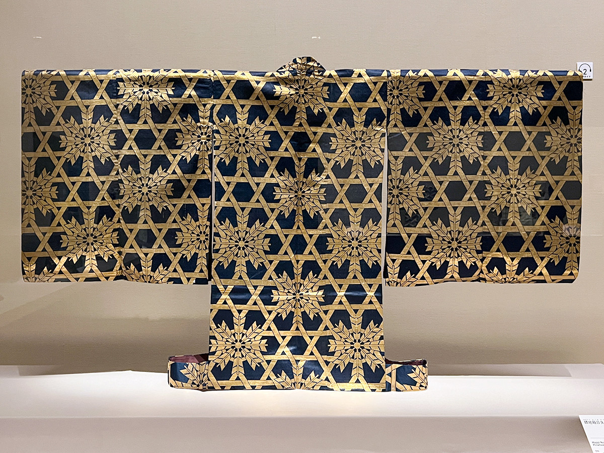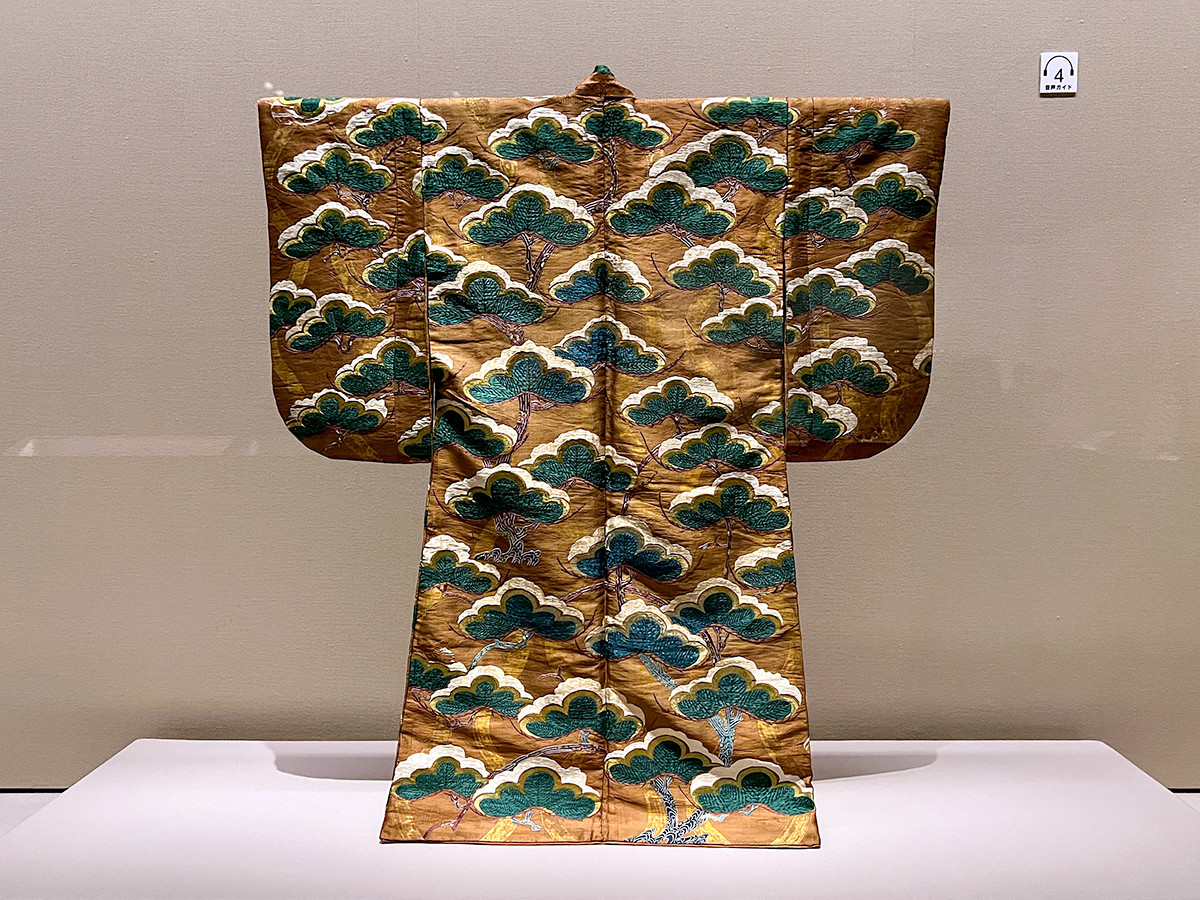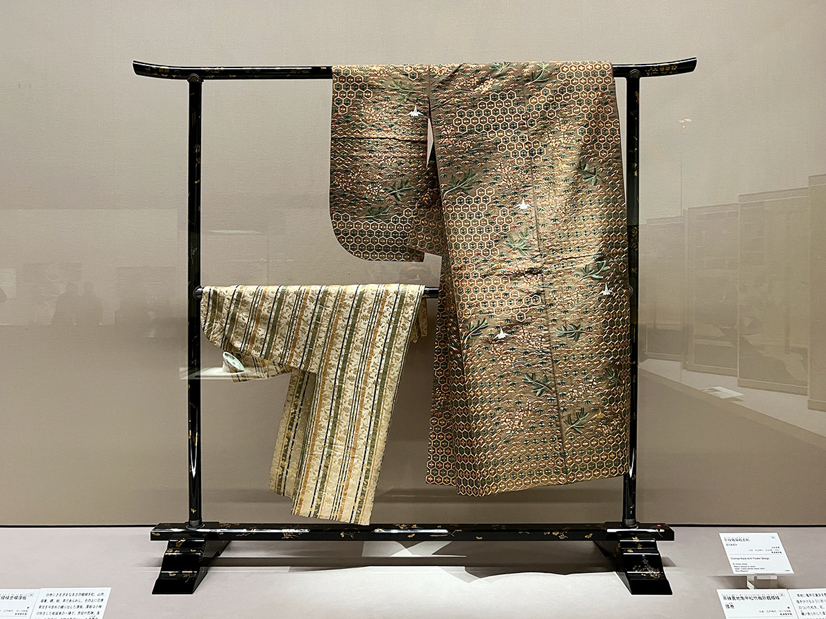 《白茶地堅縞唐草模様金襴厚板》江戸時代 18~19世紀 根津美術館 / 《茶練貫地亀甲松竹梅折鶴模様腰巻》江戸時代 18~19世紀 根津美術館 / 《折枝散蒔絵衣桁》柴田敬哉作 大正9年(1920) 根津美術館