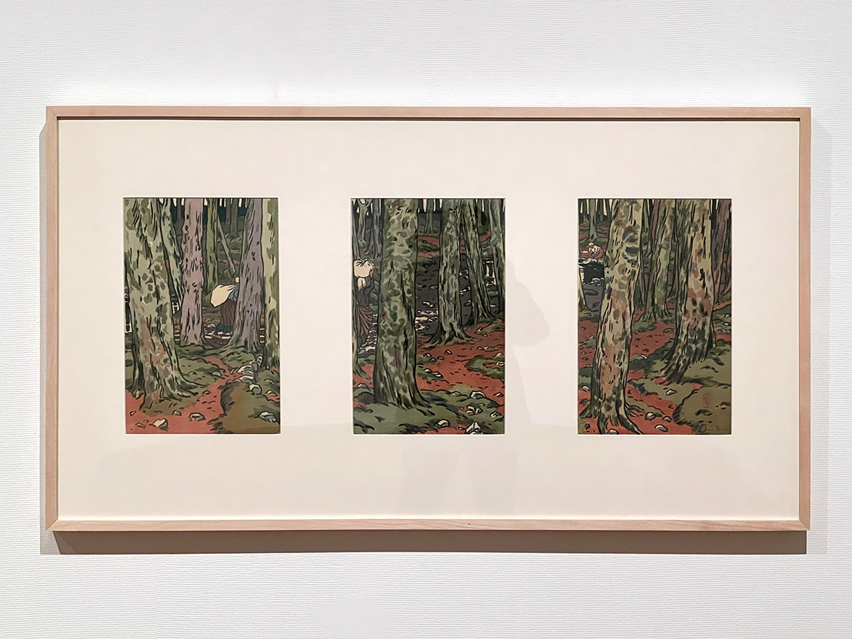 《ロギヴィーの森の洗濯場 ― 風景の連作より》は、この手法を取り入れた作品。木々の間に女たちの姿が見えます。サイズや型式も浮世絵の3枚続に近く、左下には落款を模したモノグラムまで入っています。