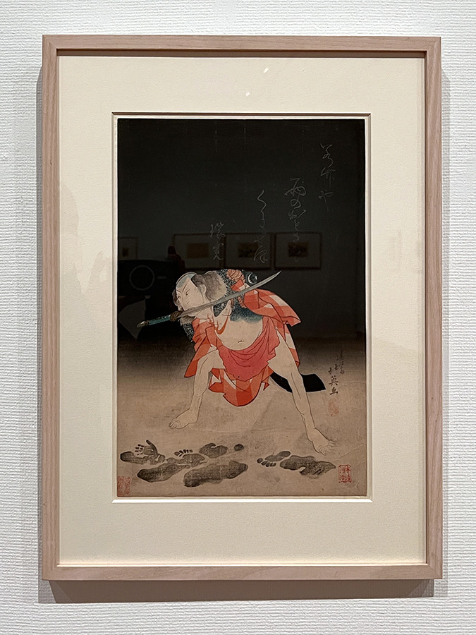 《二代目嵐璃寛の団七九郎兵衛》は、芝居「夏祭浪花鑑」に取材した作品。暗闇の中で舅を殺した団七九郎兵衛が、黒い背景の前で、不気味に刀をくわえます。