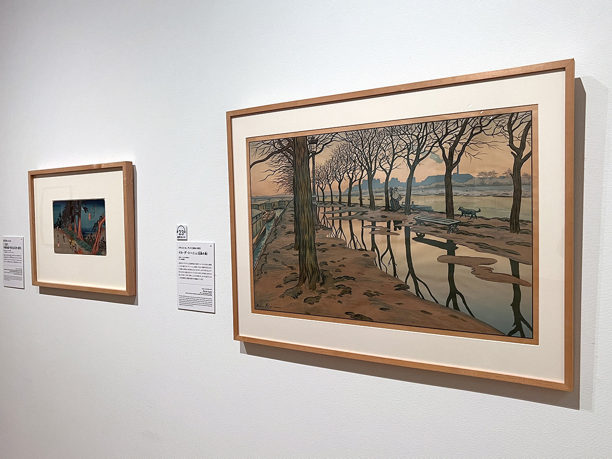 第6章は「木と花越しの景色」。木や花などの間から向こうの景色を見通す構図は、葛飾北斎や歌川広重の版画作品に多く見られます。版画は平面性の高い表現ですが、近景と遠景を明快に分けることで奥行きを出しています。