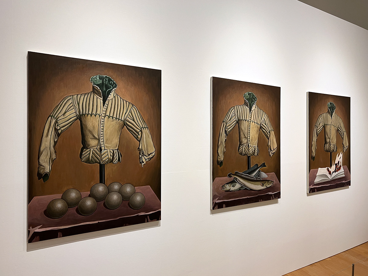 (左から)ユアサエボシ《着衣のトルソーと八つの砲弾》2021年 / ユアサエボシ《着衣のトルソーと二匹の魚》2021年 / ユアサエボシ《着衣のトルソーと燃えている本》2021年