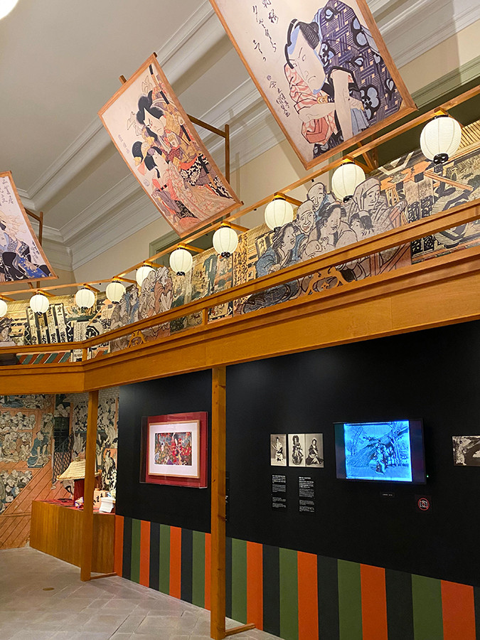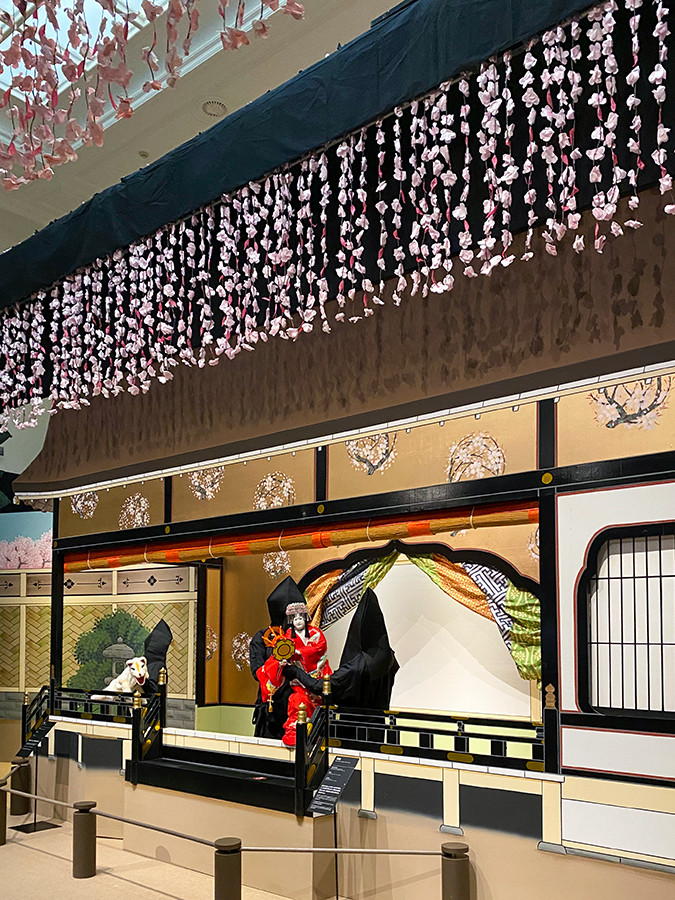 入口に現れるのは『金門五山桐』「南禅寺山門の場」の舞台を再現したもの。 花道やセリなど客席の目の前で役者が演じる舞台演出は、歌舞伎ならではと言えます。舞台に大道具を組み立てることを「飾る」と表現しますが、絵画美・色彩美にも富んだ大道具や吊道具が魅力です。