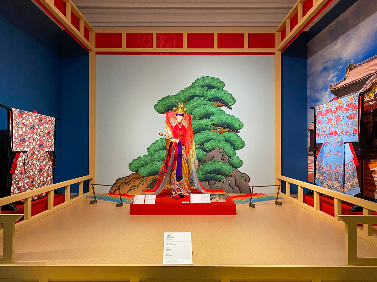 首里城正殿の御庭に設置された御冠舟舞台をイメージした舞台の再現とともに、沖縄の古文献をもとにして創作されたといわれる『銘苅子』の天女も立体展示されています。紅型衣裳や小道具、装身具類は、沖縄ならではの色彩を感じさせます。