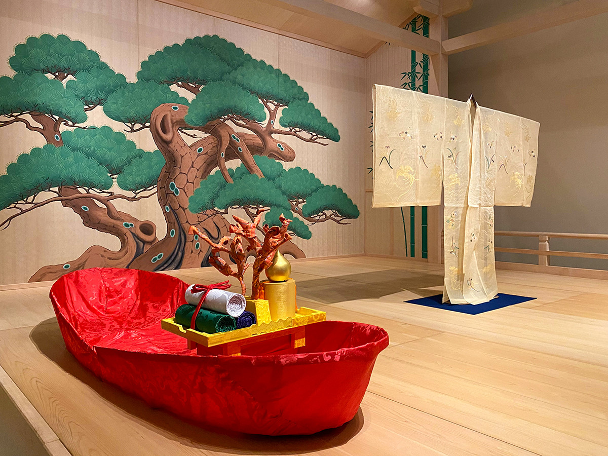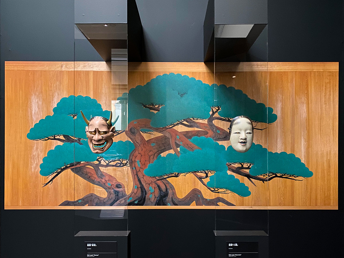 能舞台は、かつて野外で行なわれていたため、屋根や四隅に柱があります。演者が自分の立ち位置の目印にする柱「目付橋」や遠近感を感じさせる大小異なる松を舞台で感じることができます。ここで紹介されているのは、3月に初公開となる復曲能『岩船』をテーマにした能舞台です。