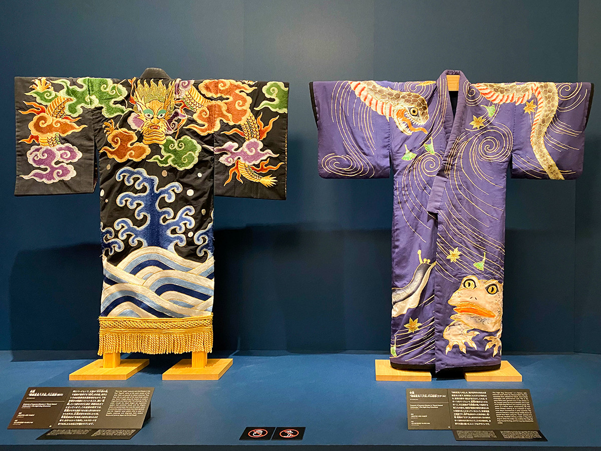 華やかな舞台衣裳や歌舞伎独自の化粧である隈取についても展示されていますが、ここでは、七代目市川團十郎が「歌舞伎十八番」に制定した演目のひとつ「暫」の衣裳を紹介します。