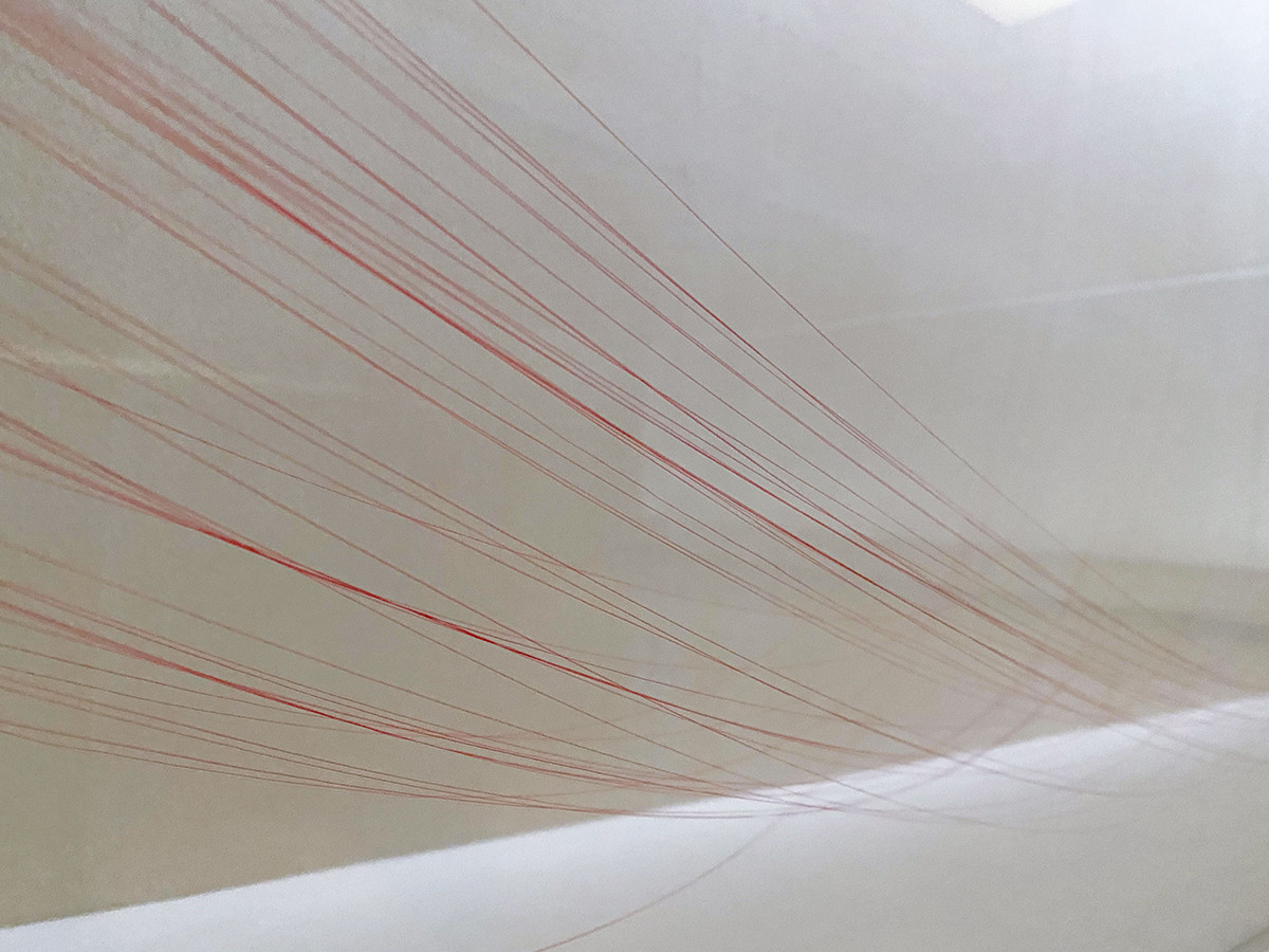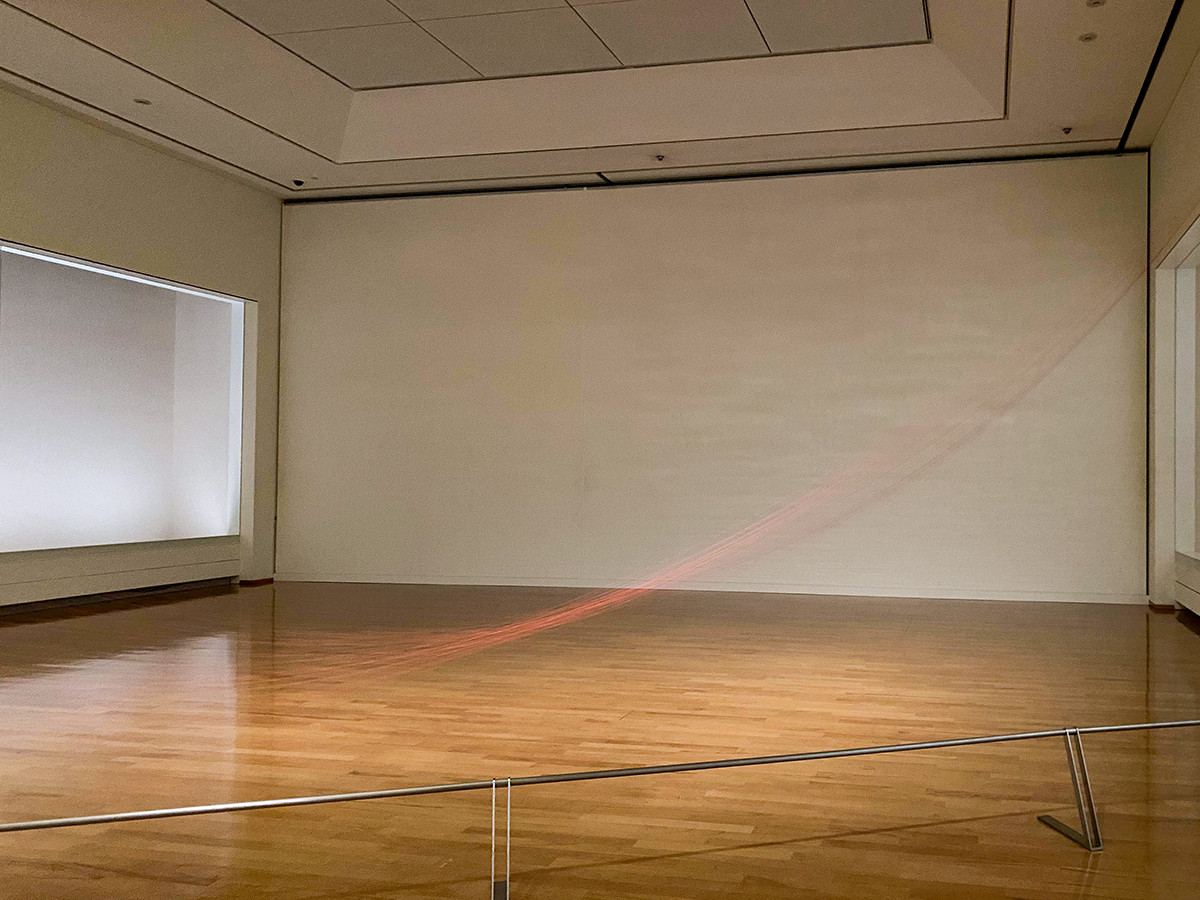 遠くからでは帯の様に見える3つ目の作品。10センチ間隔で配置された糸は、“面”の要素が強くなっています。近づくにつれ見えたり見えなかったり、目線の高さや作品との距離、見る角度を様々に変えながら鑑賞することができます。