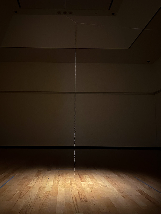 人の動きだけでなく、湿度や温度などの空気の些細な変化でも揺れる絹糸。人の動きで緩んでいた糸も、人がいなくなると緊張します。天井から約2.2メートルの絹糸が吊るされた2つ目の作品では、玉結びの跡も見ることができます。