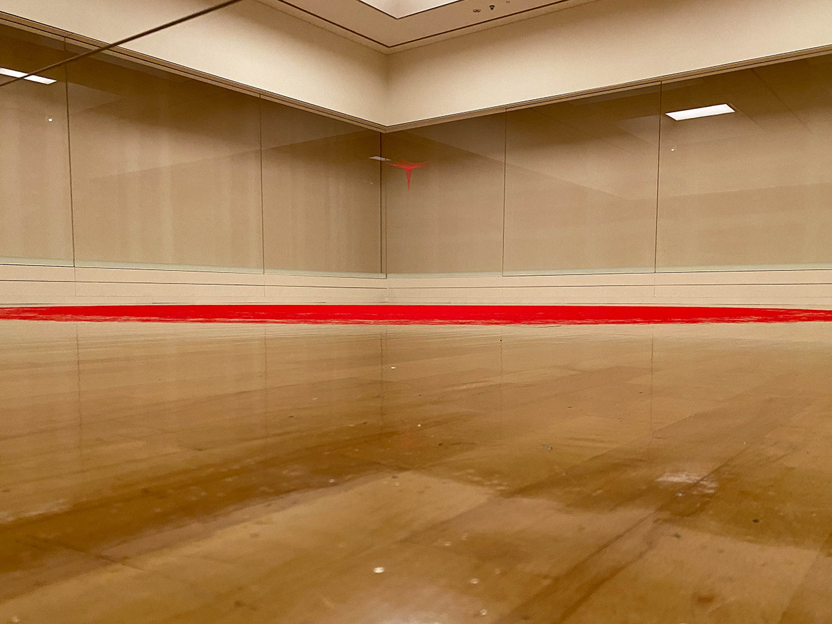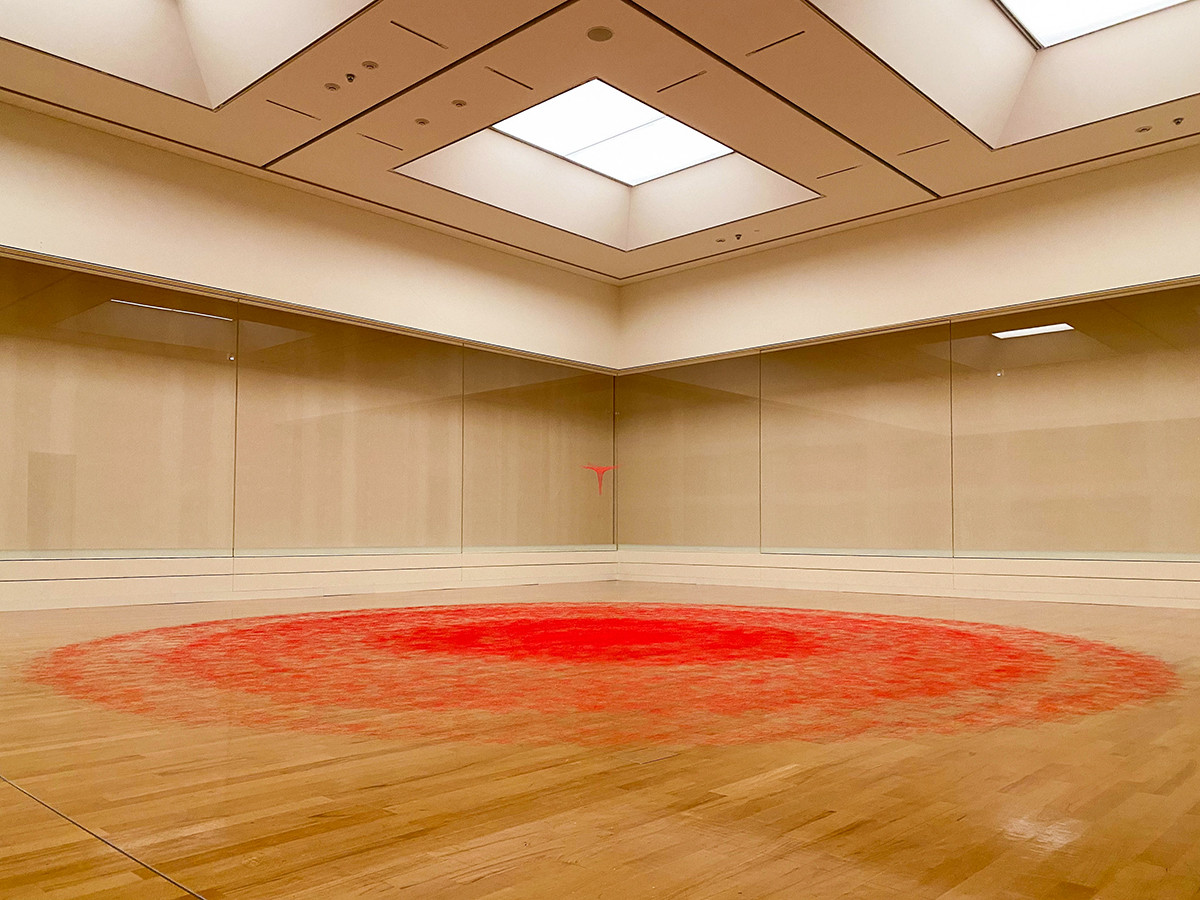 存在感溢れる赤い空間が目に飛び込んでくる1つ目の会場。床に円状に渦を巻いているのは、1本の絹糸によるもの。池内が会場で約6日かけて制作したこの作品は、1巻き1300メートルの糸を17巻分、つまり2.2万メートルもの絹糸が使用されています。