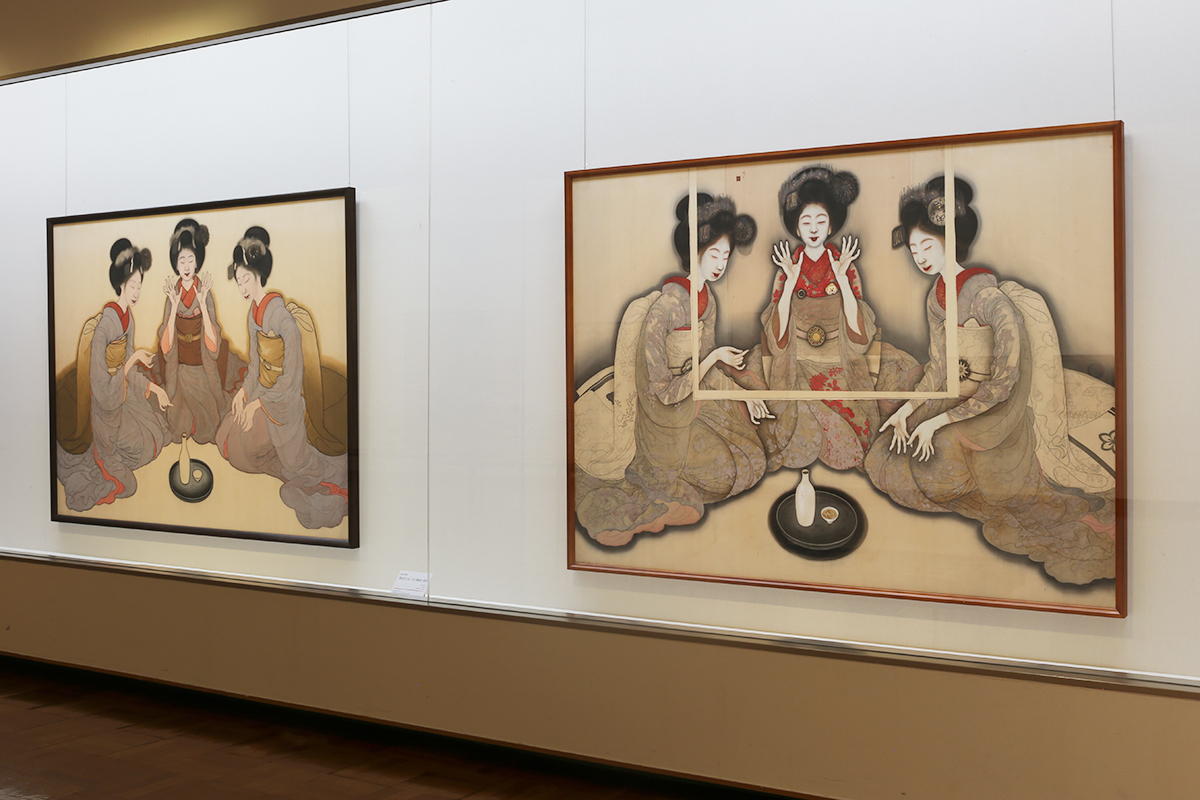 (左から)岡本神草《拳を打てる三人の舞妓》(未成)大正8(1919)年 / 岡本神草《拳を打てる三人の舞妓の習作》大正9(1920)年 ともに京都国立近代美術館