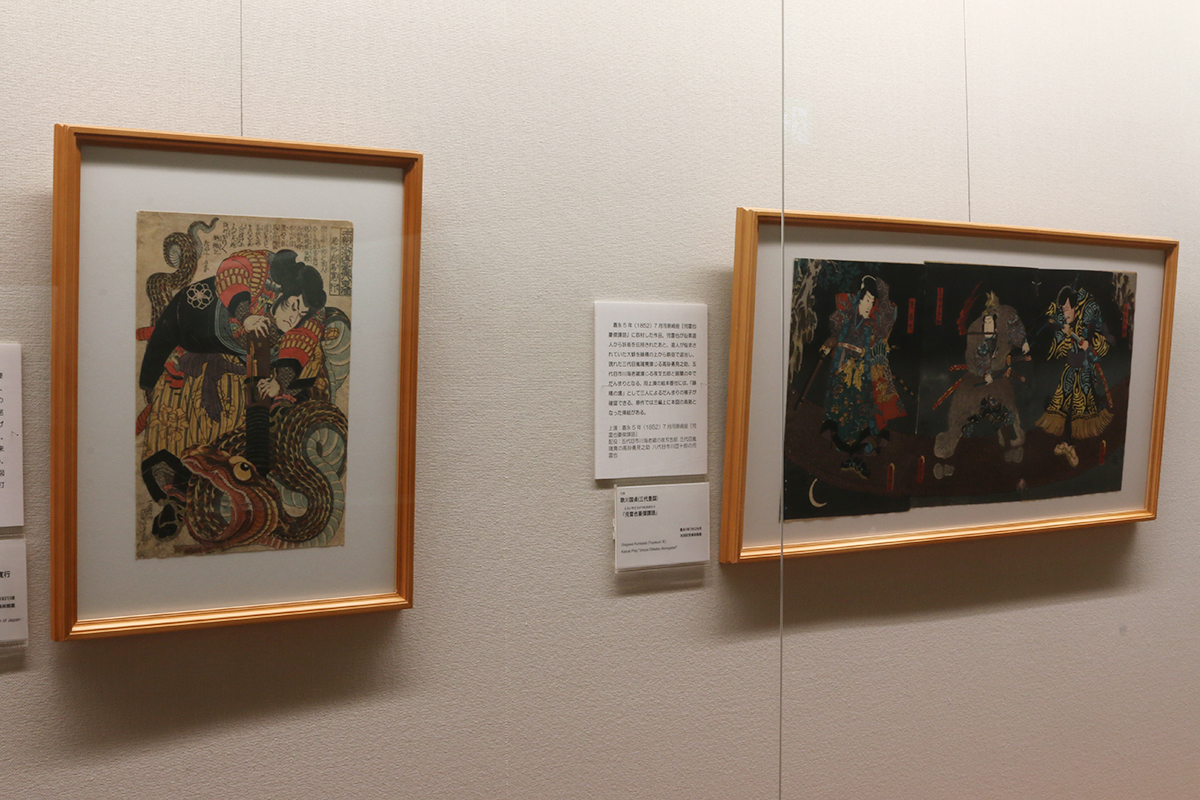 (左から)歌川国芳《本朝水滸伝 豪傑八百人一個 尾形周馬寛行》 / 歌川国貞(三代豊国)《『児雷也豪傑譚語』》