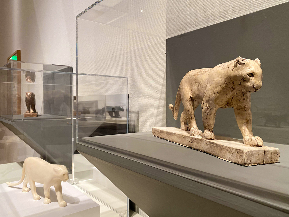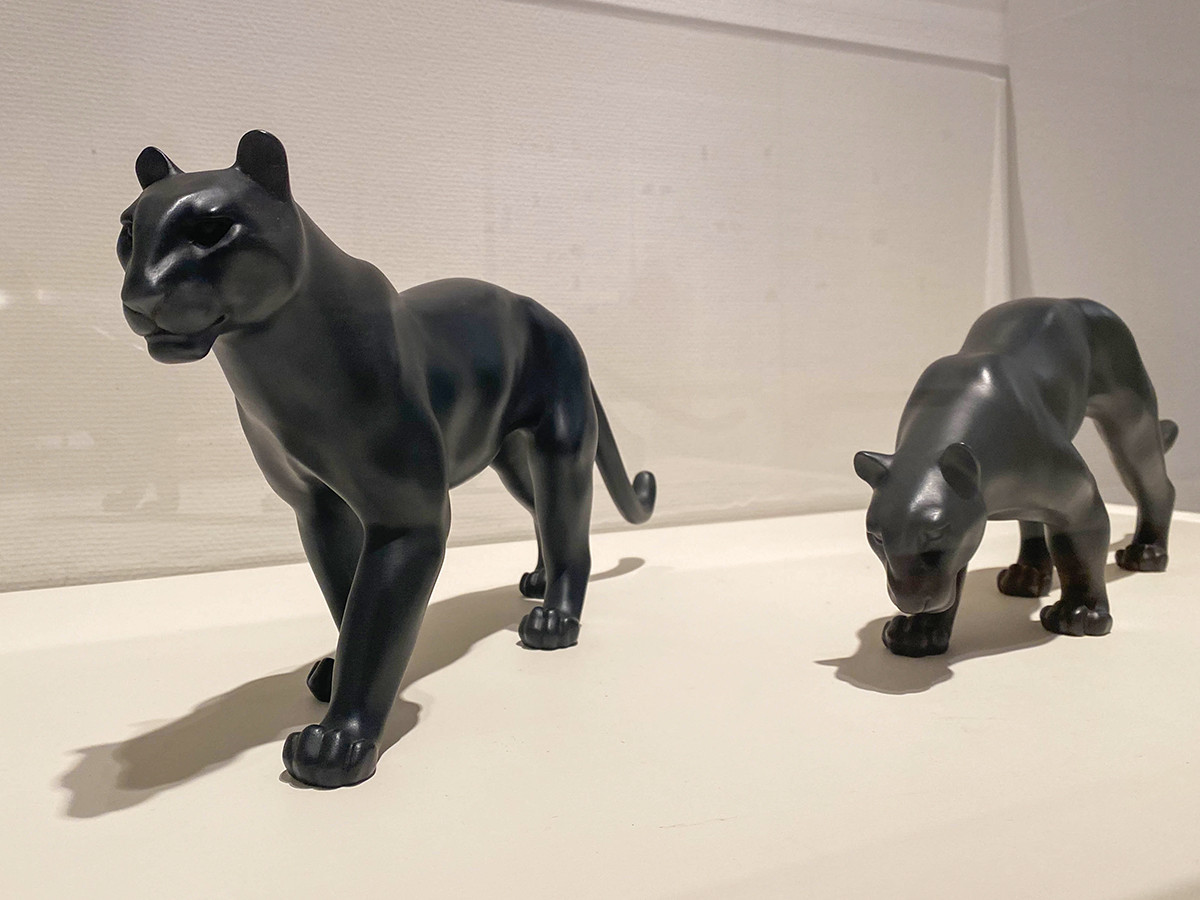 1921年から制作された豹シリーズですが、歩く豹の姿はいくつかの段階を経て洗練されていきます。巻き型だった尻尾は伸び、足は太く低い重心に。頭から尻尾までなめらかで美しいフォルムからは、獲物を狙う鋭い姿が見てとれます。