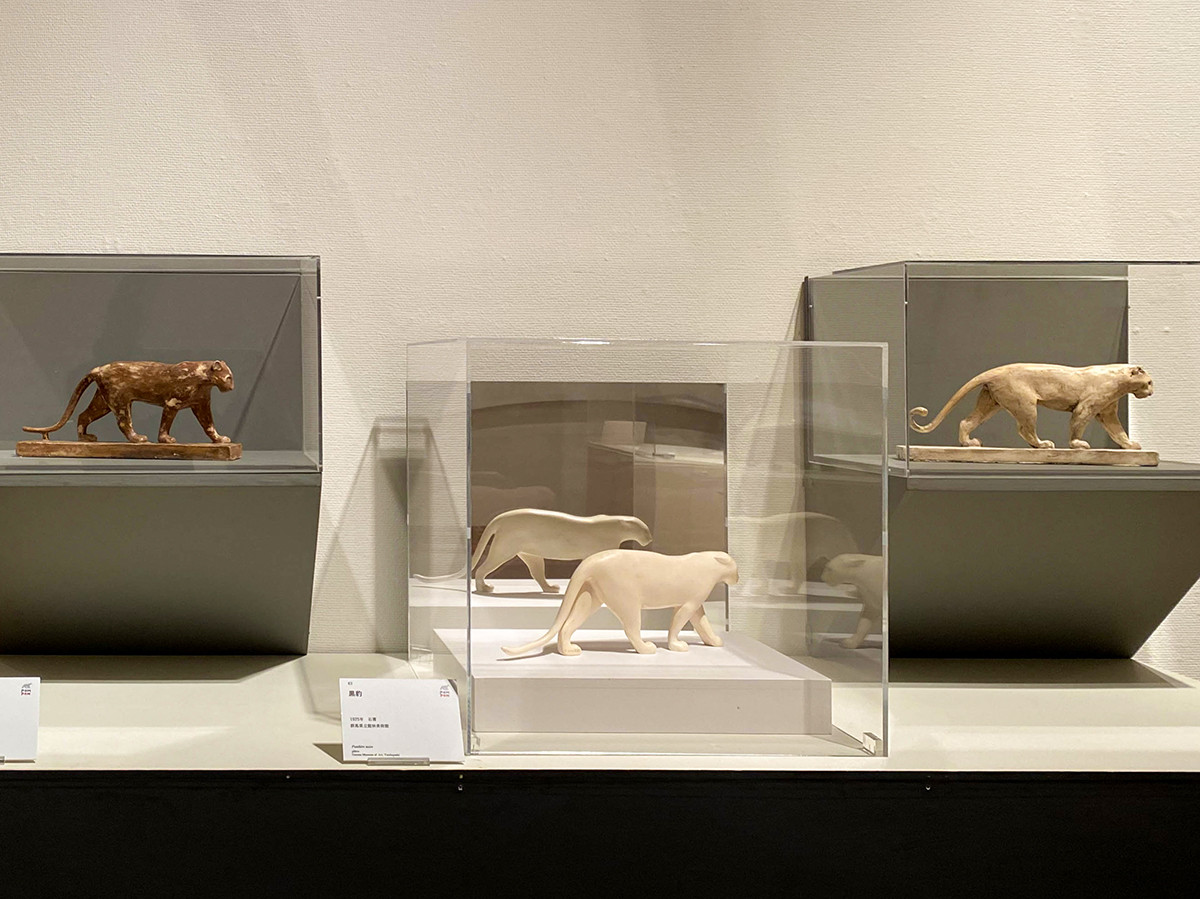 会場には、ポンポンに影響を受けたとされる佐倉ゆかりの金工家・津田信夫(1875‐1946年)の作品も紹介されています。津田は若い工芸家たちにヨーロッパの工芸事情等を伝え、モダニズム運動の推進者と評されています。留学後の津田の作品を特徴づけるものに動物置物があります。それらの作品は、自然の動きを単純化し、硬い金属で柔らかな姿態を表現しています。