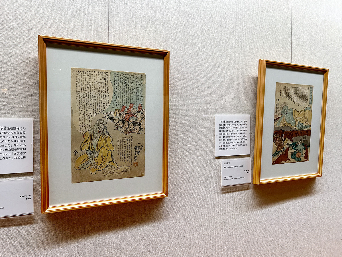 (左から)歌川国芳《奪衣婆の願掛け》嘉永2年(1849) / 歌川国芳《流行おばアさん ねがいしようじゆ》嘉永2年(1849)