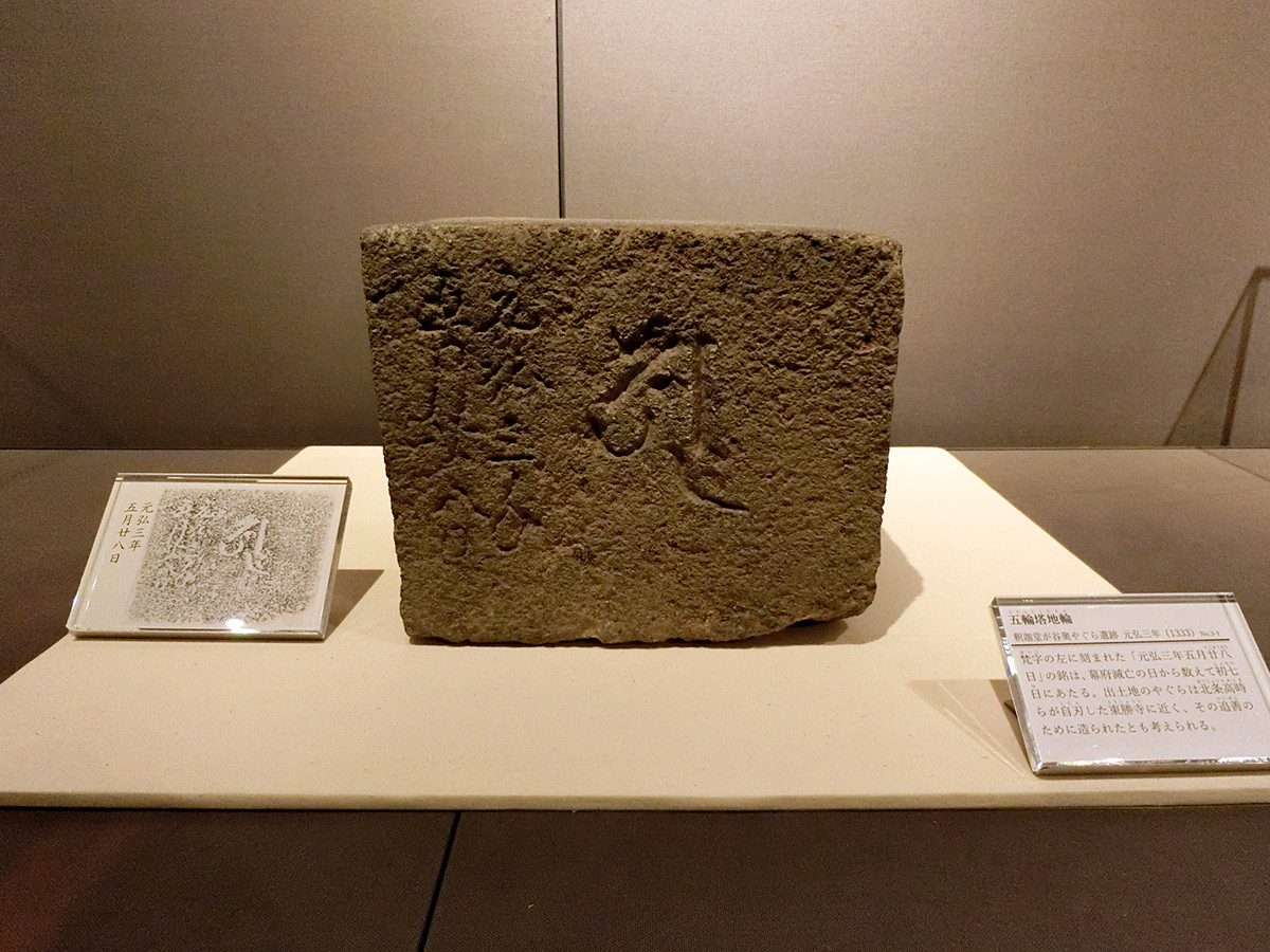 五輪塔地輪の梵字の左に刻まれた日付は、幕府滅亡から数えて七日目にあたる初七日。出土地は北条高時らが自刃した東勝寺に近いやぐらです。