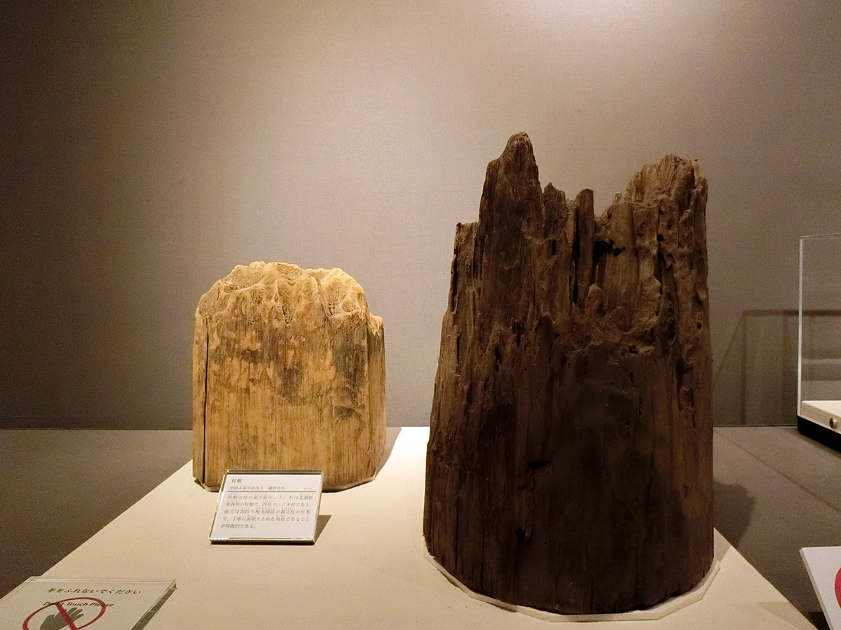永福寺の柱根(柱の最下部)です。右は円柱のヒノキ材、後方は丁寧に面取りされた角柱であることが特徴的です。