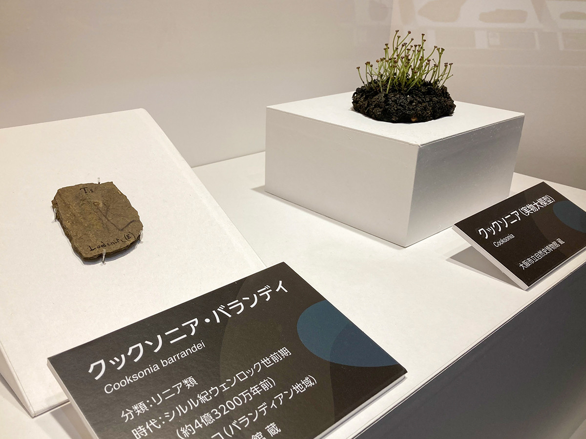 その反対側にはクックソニア・バランディの化石。円谷プロダクション風の模型と並ぶこの小さな化石は、4億3200万年前の地層から発見されたもので(目に見える大きさの中で)最古の植物化石!