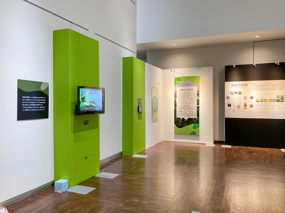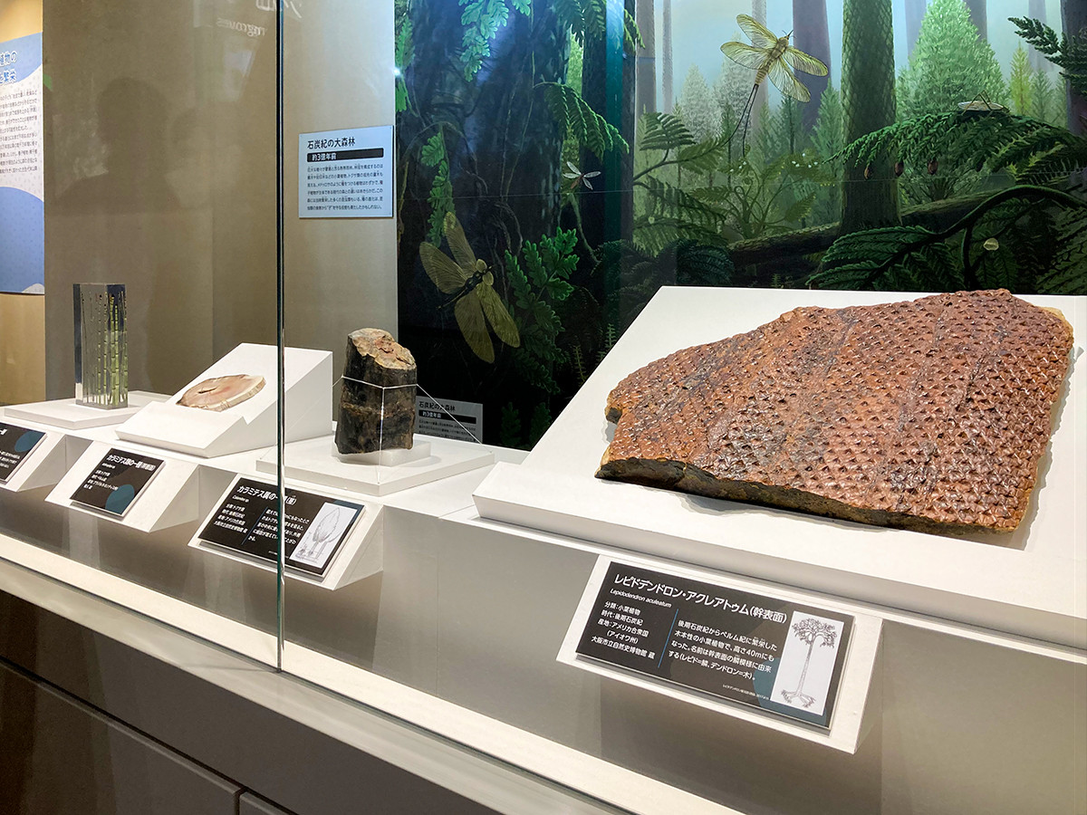 第4章「植物はどのように進化してきたか」では、美しい古生代イラストをバックに大阪市立自然史博物館が誇る化石コレクションをはじめ植物化石が展示されています。