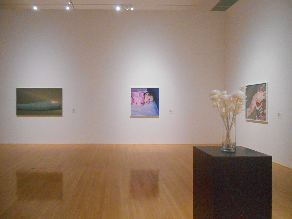 次のコーナーでは、死と眠りに関連した作品が並んでいます。展示室中央に、白い花の作品があります。花の部分が白い花は、花屋でも見かけますが、葉も茎も白い花は、とても不気味で、不吉な雰囲気があります。