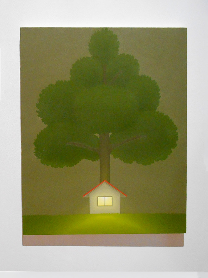 展示は、マジックアワーと呼ばれる夕方の情景からスタートします。入口のすぐ左手に、玄関に明かりをともした一軒家の作品があります。穏やかな光が周りを照らし、背後の大きな木が家を守っているかのようです。