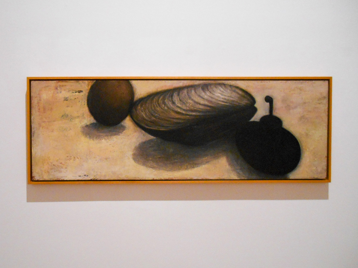 次のコーナーでは、大きくて黒い貝の作品が目を引きます。沈黙を表現する場合に「貝になる」という言い方がありますが、この貝は目を閉じるという意味のようです。