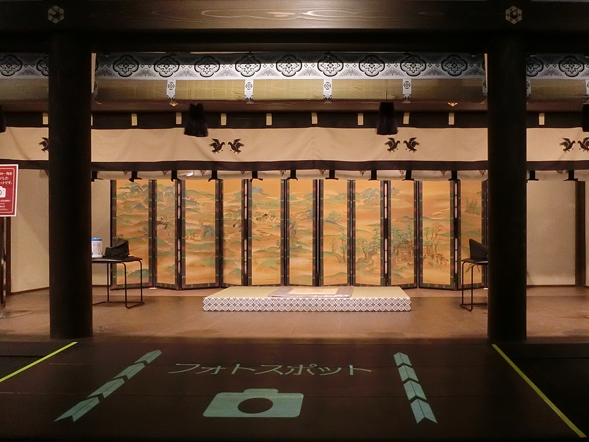 鎌倉幕府の一角をリアルに再現したコーナーはフォトスポットになっています。屏風を背景に2種類の烏帽子が用意され、義時や頼朝気分を味わうことができます。
