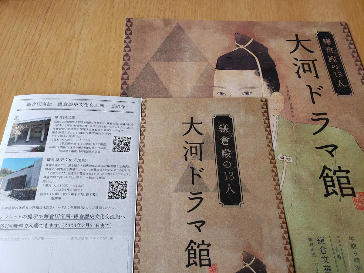 大河ドラマ館入館時に配布されるパンフレットを提示すると、鎌倉国宝館・鎌倉歴史文化交流館へ各1回無料で入館することができます。(2023年3月31日まで)