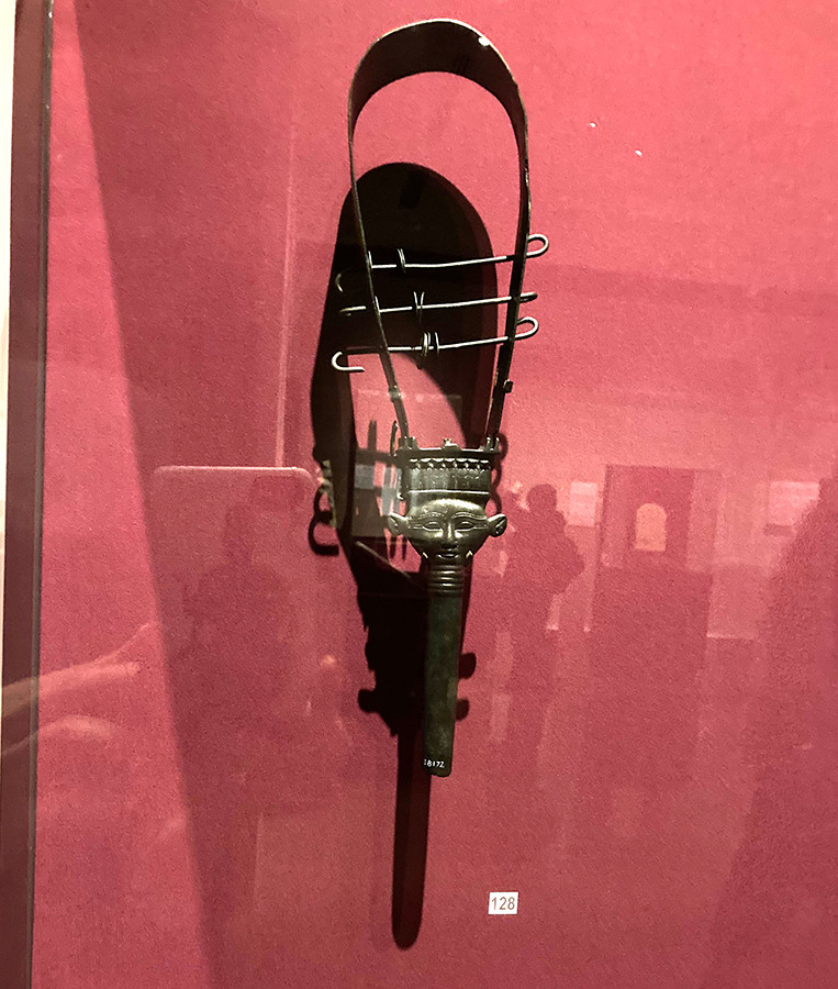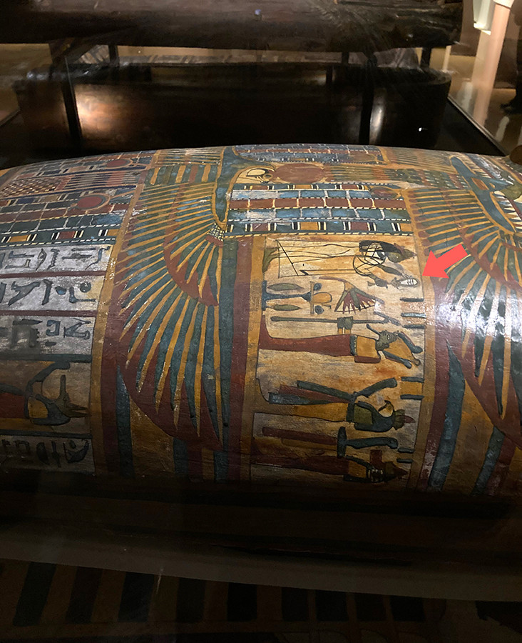 内棺の左胸には、神々の前でシストルムという楽器を奏でるタケネメト氏の姿が描かれています。シストルムは儀式等で用いられた、振るとガラガラ鳴る打楽器。神社の神楽鈴みたいな感じなんでしょうかね。