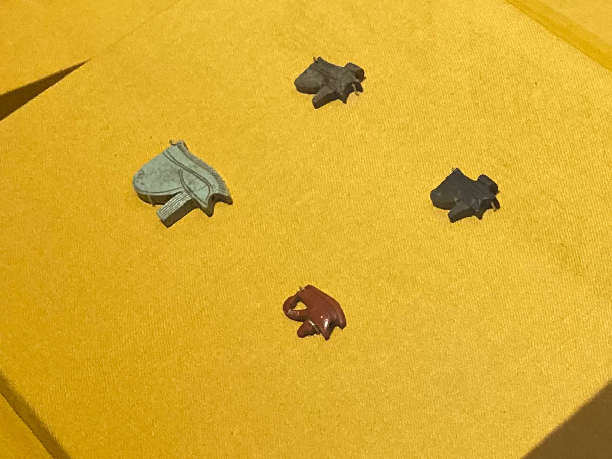 さて、関連展示では、古代エジプトの八百万の神々や護符を紹介。人の体に鳥の顔がのった鳥人のトト神やホルス神が精悍でかっこいいです。