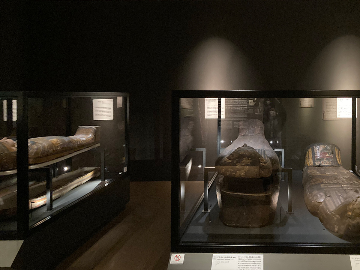 本展の紅一点ミイラ・タケネメト氏、下がり眉の表情やわらかな美人で、図録のカバーガールもつとめています。三重の木棺(内棺・中棺・外棺)が全て展示されているのも注目ポイント。