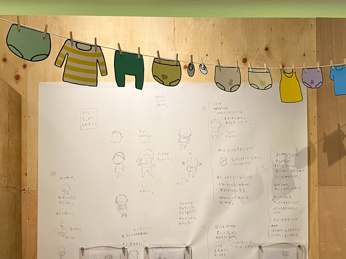 はっきりした順路もなく見ることができる会場は、一つの絵本ができるまでの過程も展示しています。