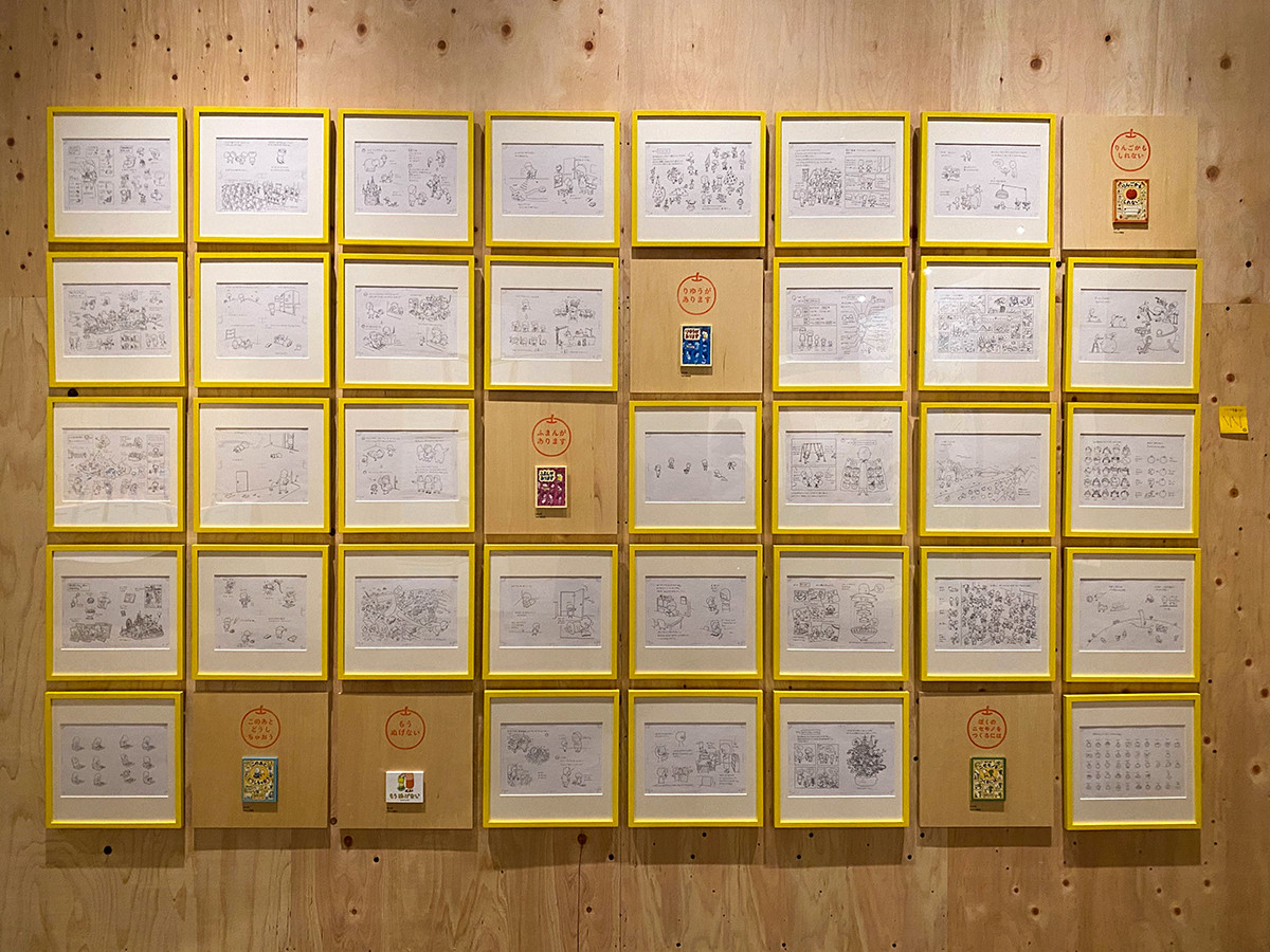 ヨシタケ氏は、絵本作家としてデビューする以前から小さな手帳に日々浮かぶアイデアや気がついたことなどをスケッチしてきました。その数は10,000枚以上にも及び、その中から厳選された約2000枚もの複製スケッチが壁一面に並んでいます。