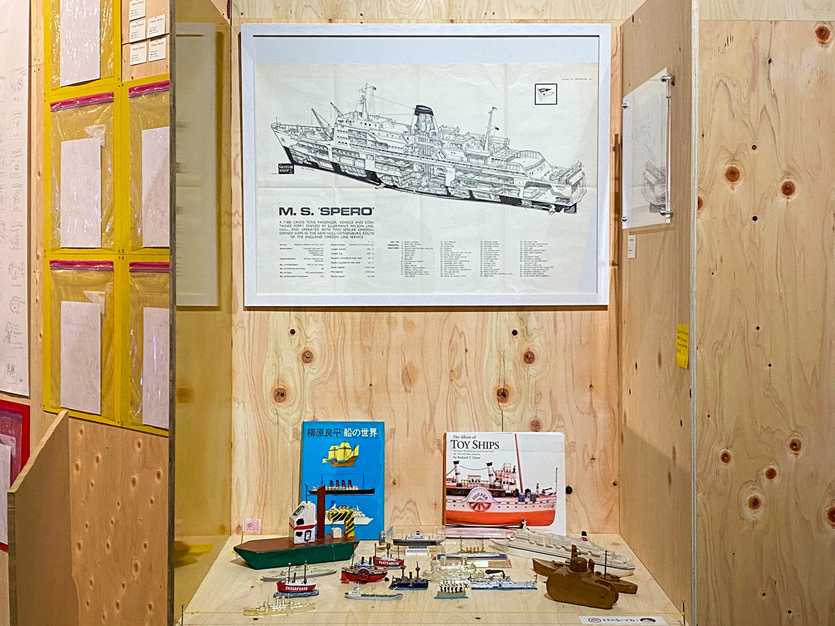 学生時代の立体作品やアトリエに並んでいる貴重な私物コレクションも飾られ、ヨシタケ氏が何に影響を受けてどんなものを見ながら創作をしているのかも窺うことができます。