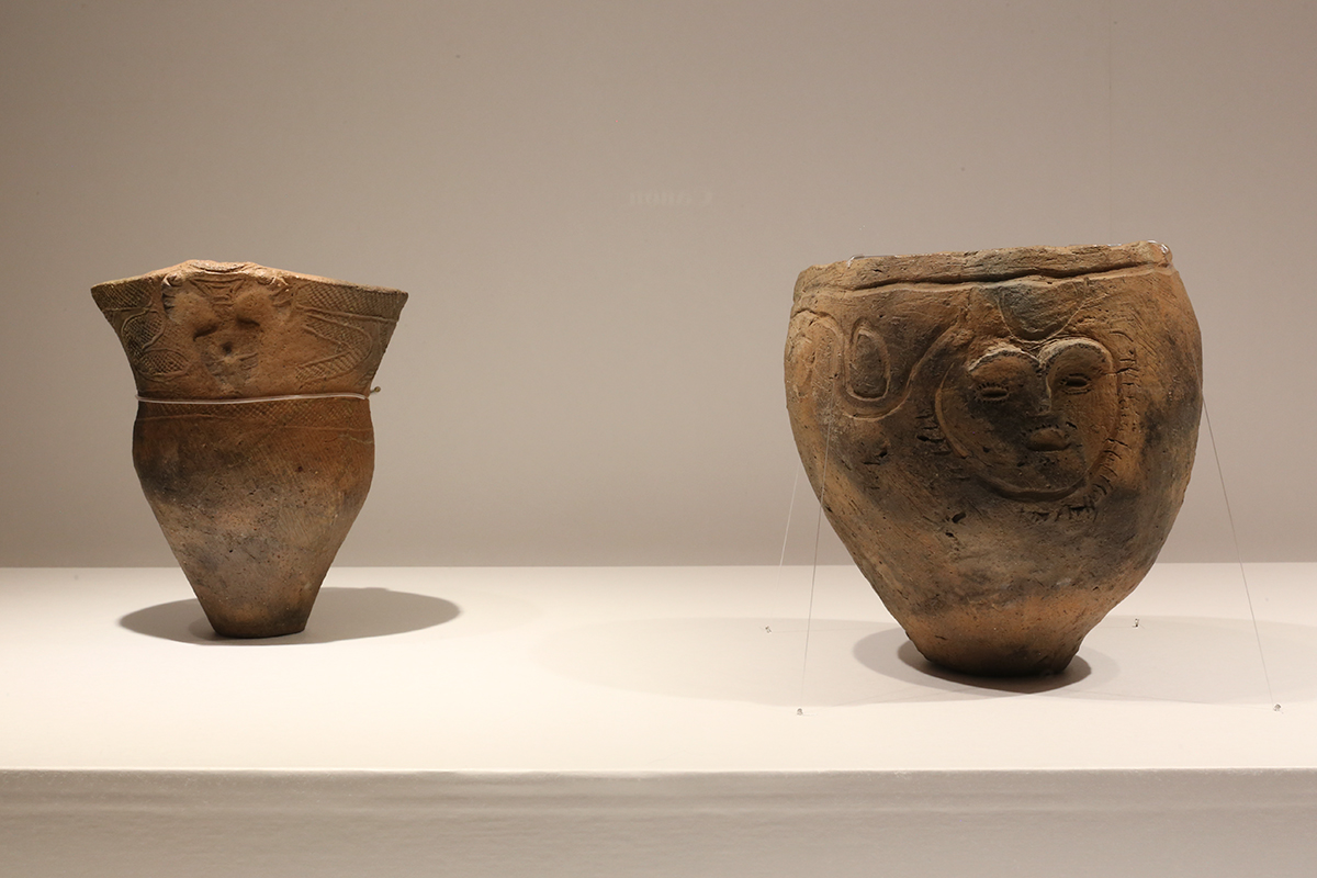 (左から)《人形装飾付深鉢形土器》 / 《顔面装飾付深鉢形土器》ともに 埼玉県さいたま市 馬場小室山遺跡出土 さいたま市立浦和博物館蔵