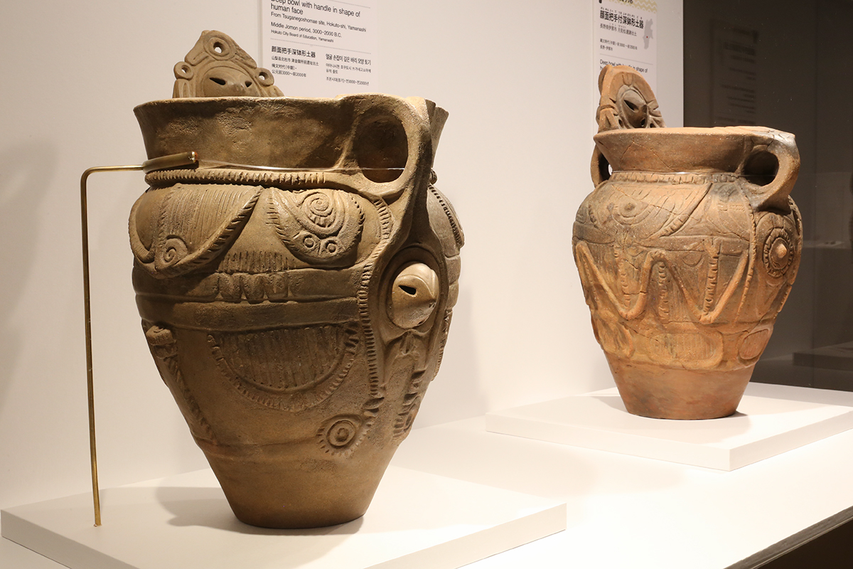 (左手前から)《顔面把手付深鉢形土器》山梨県北杜市 津金御所前遺跡出土 山梨・北杜市教育委員会蔵 / 《顔面把手付深鉢形土器》長野県伊那市 月見松遺跡出土 長野・伊那市蔵