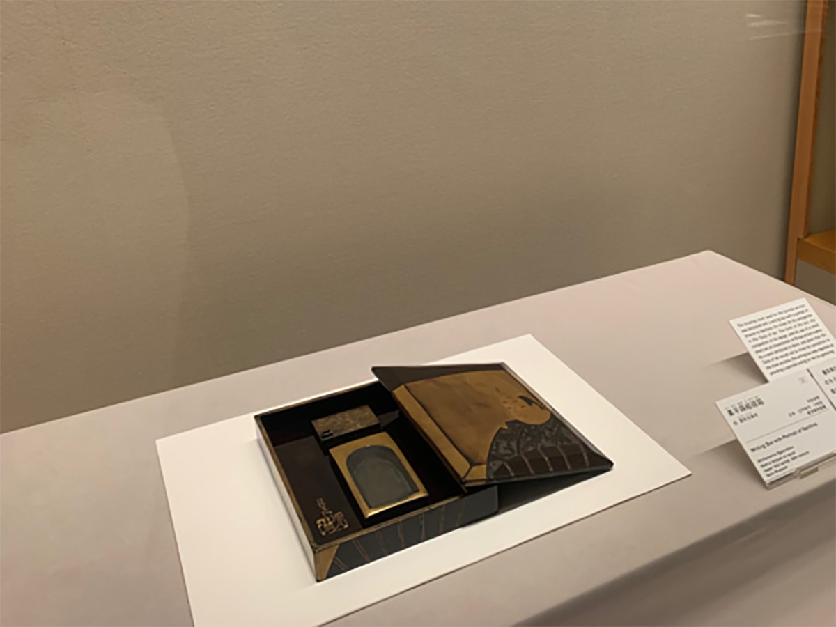 番茶席は、廊下をつたった小書院で開催されました。番茶と果物が出されましたが、小書院にも名品の数々が飾られていました。 『伊勢物語』のつながりから、「茶会の殿を務めた」と評された「平蒔絵硯箱」。在原業平があらわされた硯箱で、厚い金属を貼りつける琳派の蒔絵らしい技法が用いられています。