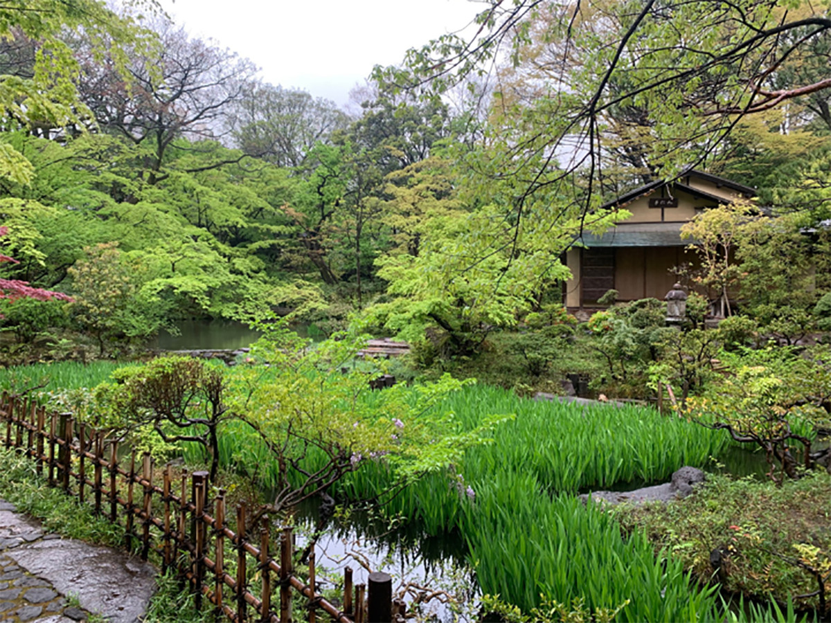 根津美術館を見学する際は、歴史ある庭園の散策にもゆっくりと時間をとりたいものです。表参道駅からすぐとは思えない、大変静かで自然の斜頸が残る美しい庭園です。小径の起伏も楽しみながら進むと、大正初期に建てられた茶室「弘仁亭・無事庵」がありました。その前には池があり、群生する燕子花が、間もなく見ごろを迎えます。
