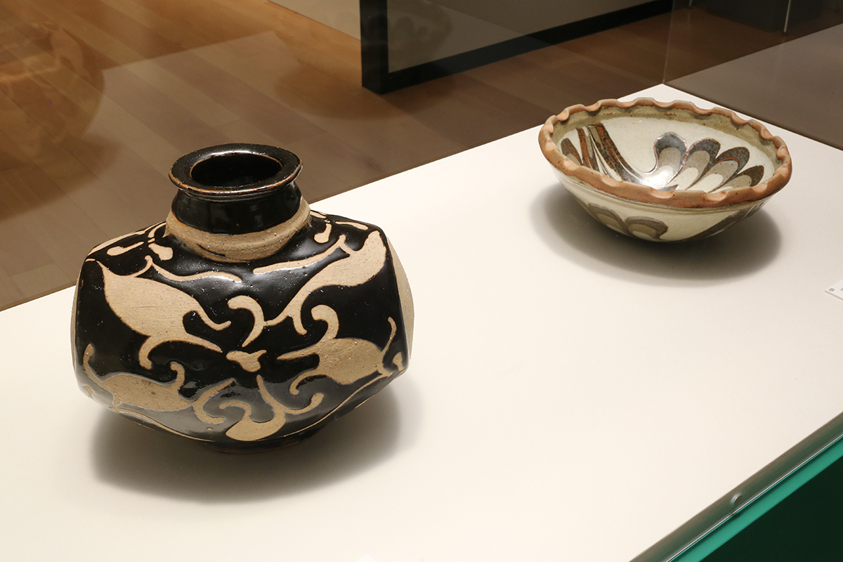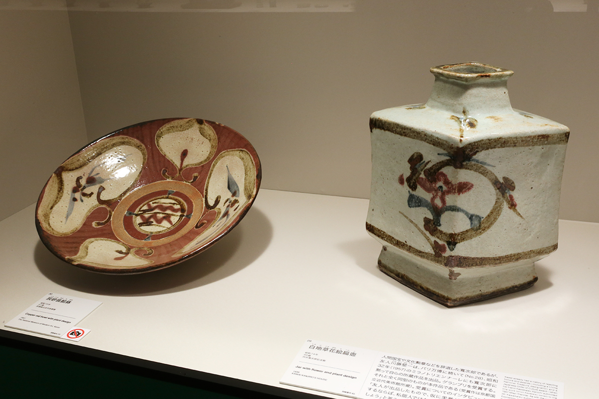 (左から)《辰砂抜絵鉢》1941年 京都国立近代美術館蔵 / 《白地草花絵扁壺》1939年 河井寬次郎記念館蔵