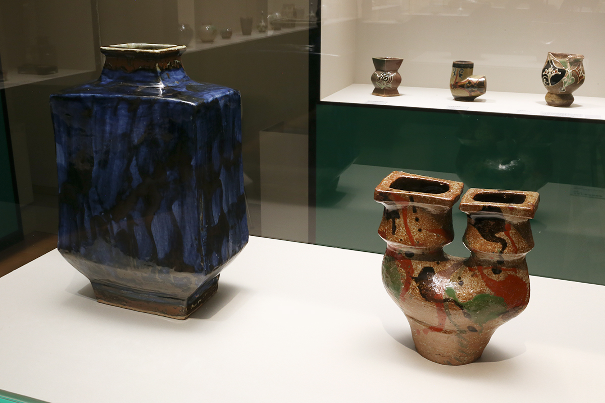 (左から)《二彩双龍耳壺》1923年頃 山口大学蔵 / 《兎糸文火焔青香爐》1921年頃 山口大学蔵