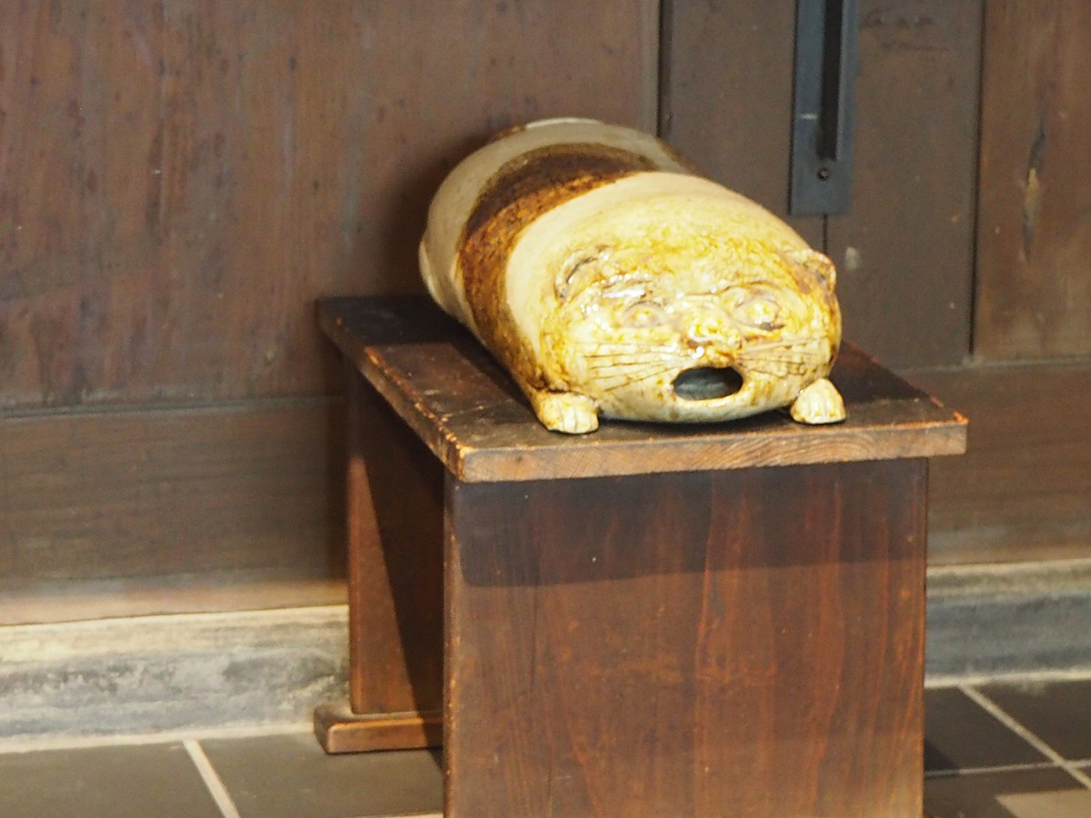 陶製のネコの形をした枕。表情がユニーク(常設)