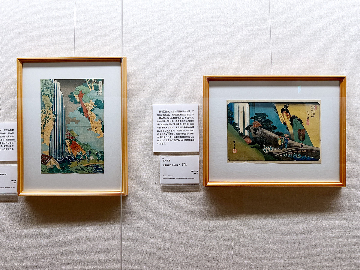 (左から)葛飾北斎《諸国瀧廻り 木曽海道小野ノ瀑布》天保4年頃 / 歌川広重《木曽海道六拾九次之内 上ヶ松》天保7~8年頃