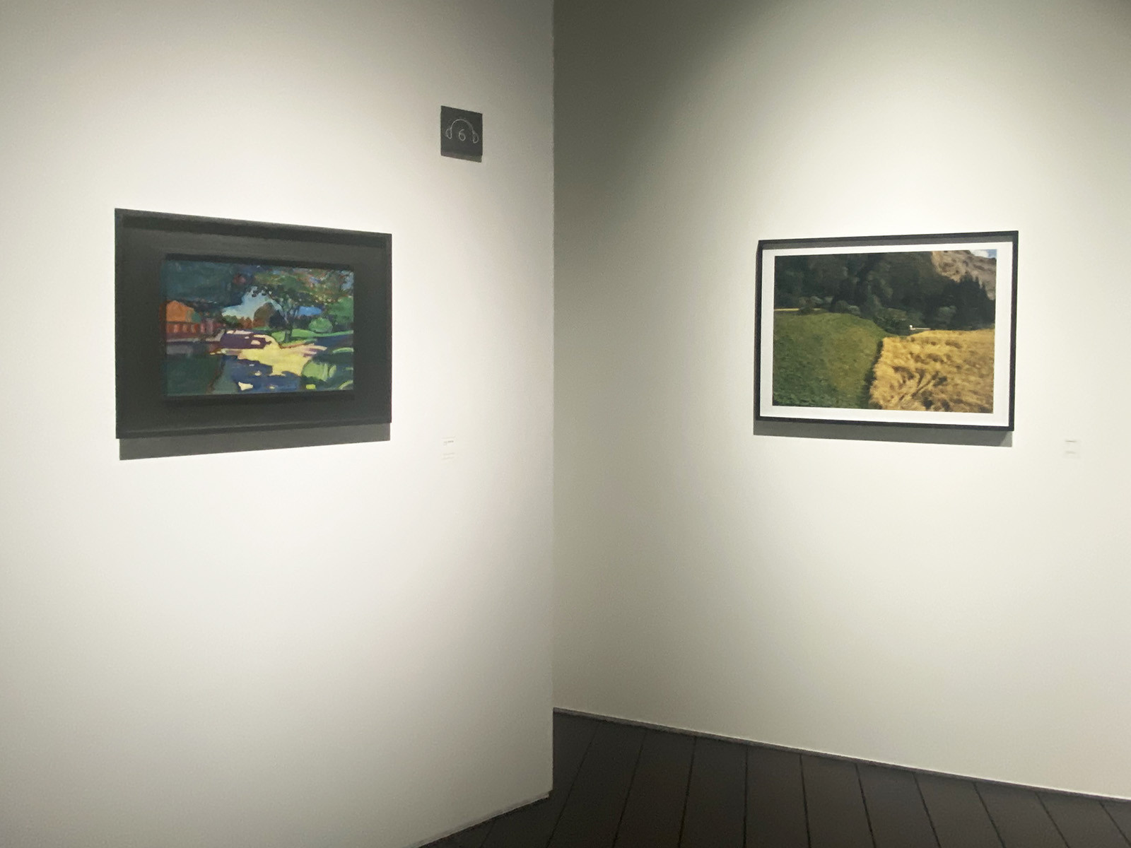 右の柴田の《新潟県魚沼市》の黄、明るい緑、暗い緑、茶色がそれぞれ色の面を作っていて、確かに押したり、引いたりしながら画面全体にうねりを作っているように思えます。