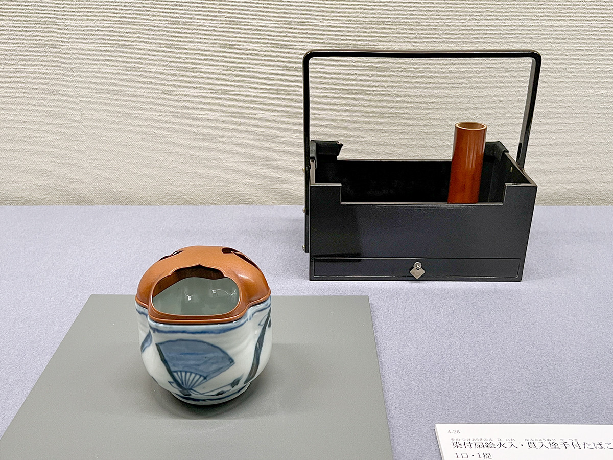 《染付扇絵火入・貫入塗たばこ盆》は、火入が和全の作。胴の見込み底に扇の絵が描かれており、古染付の写しと思われます。